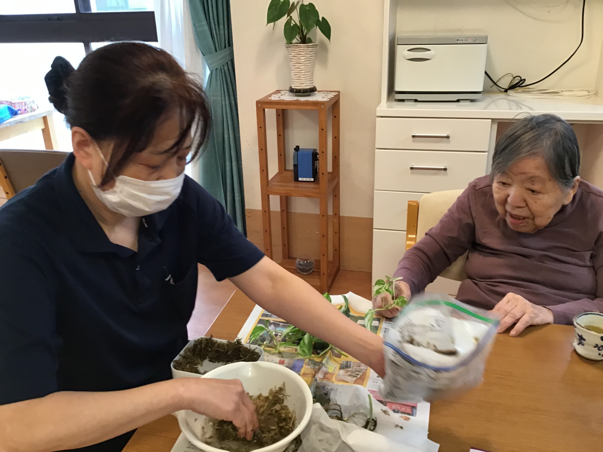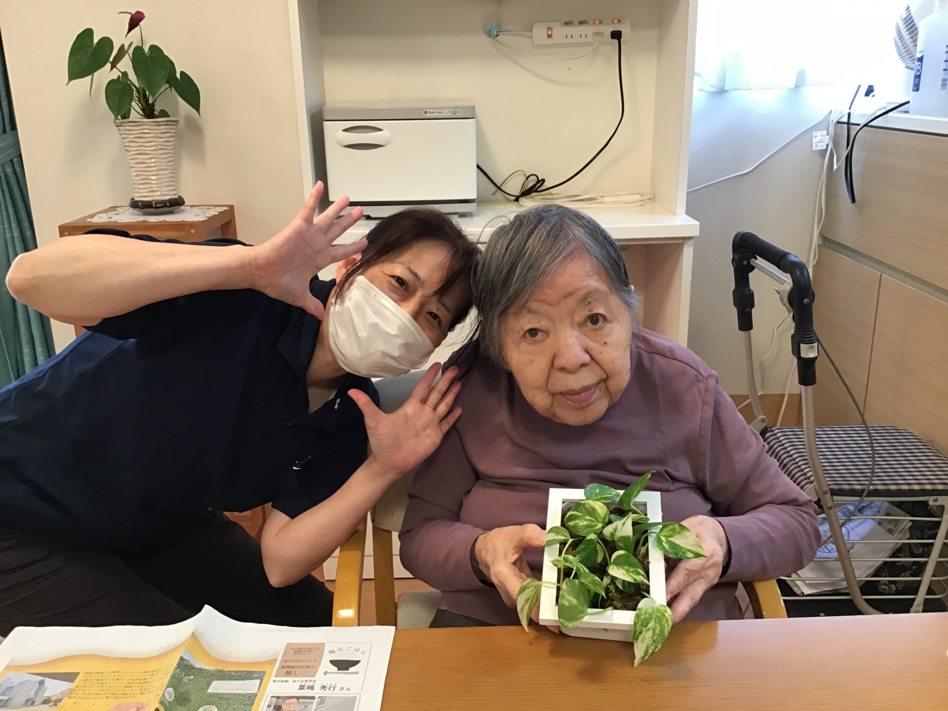2025.05.26 活動報告 観葉植物の植え替え Tweet シェアする ポトスの葉を水耕栽培して、今回は土ではなく苔を蔓に巻き付けお洒落に飾りつけをしました。 写真立てを使用し壁飾りに変身~ 気に入ってくださり、園芸教室開催?!。。。(^^♪ 【なつめユニット 山岸】 前の記事 2025.05.26 活動報告 ごはんのお供どちらにしようかな? 次の記事 2025.05.25 活動報告 夕食後に2人でお散歩される 一覧へ戻る