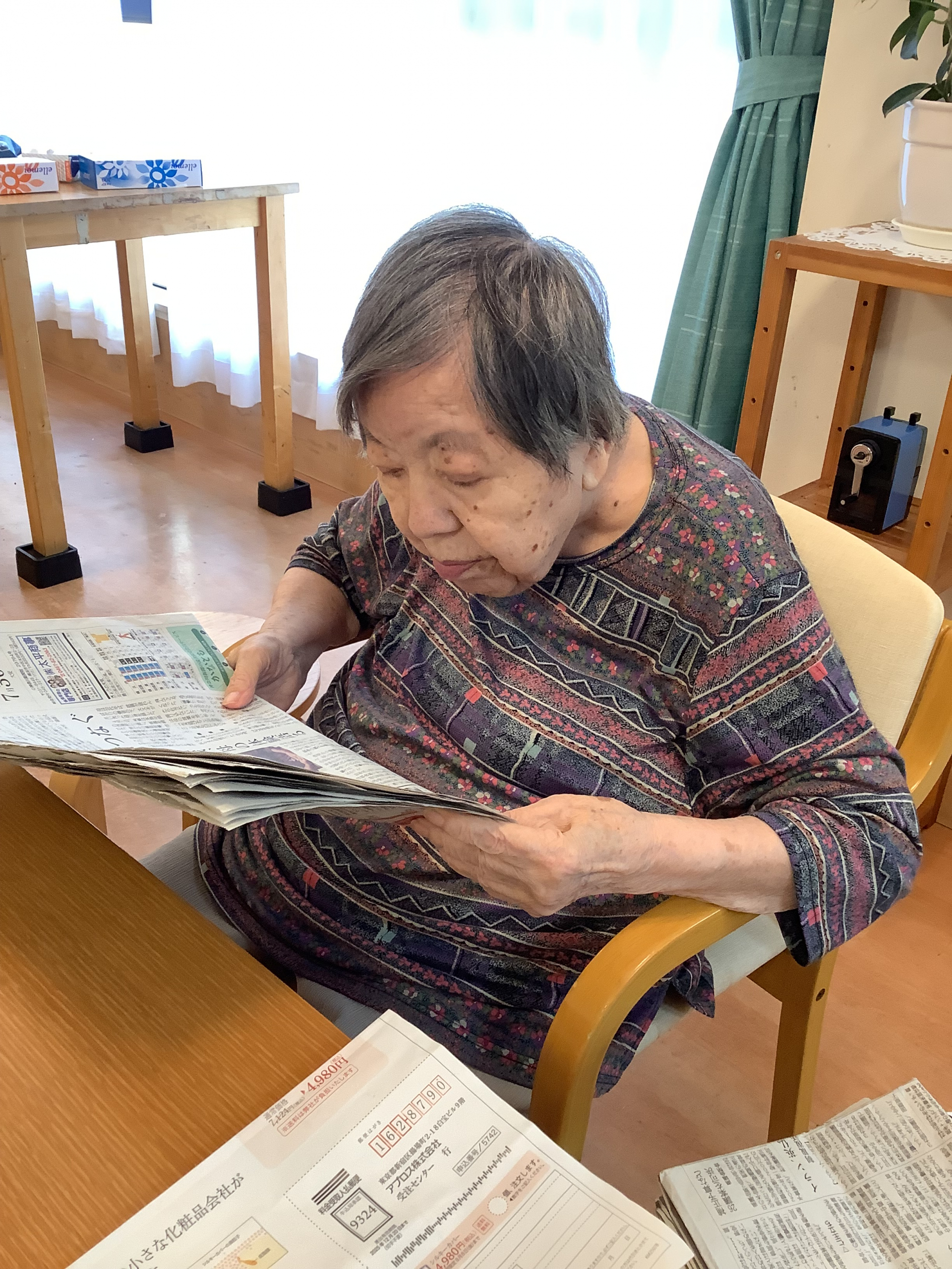 2025.07.30 活動報告 おやつのあと Tweet シェアする おやつを召し上がった後で、ゆっくり新聞を読んでいらっしゃいます。 「本も好きなの。字を読むのが好きなのね。」とのんびりと過ごされています。 なつめユニット はな 前の記事 2025.07.31 活動報告 ピアノ鑑賞 次の記事 2025.07.30 活動報告 水やりをしてくれました。 一覧へ戻る