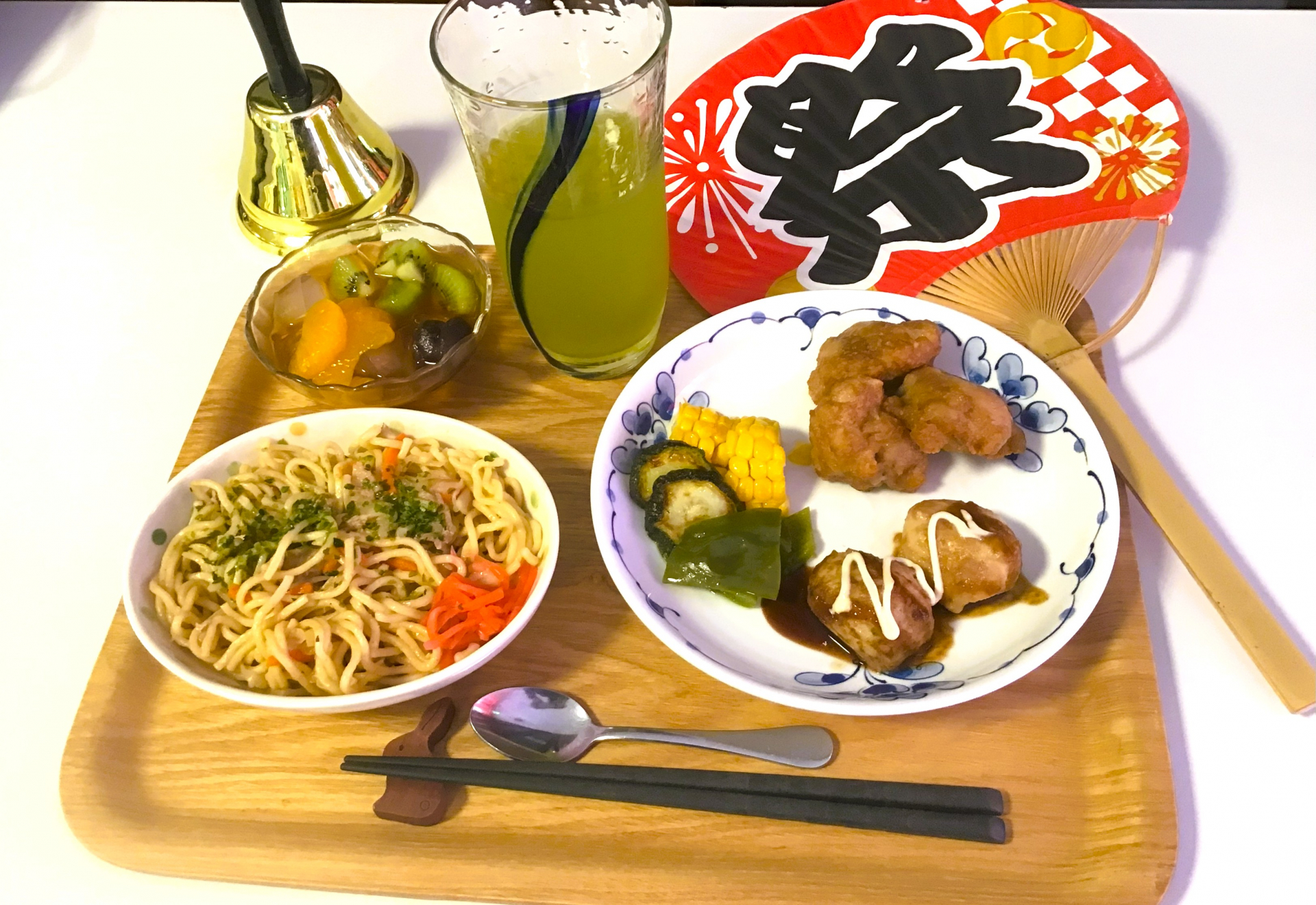 昼食では、焼きそば・たこ焼き・からあげ・夏野菜のグリル・あんみつを。