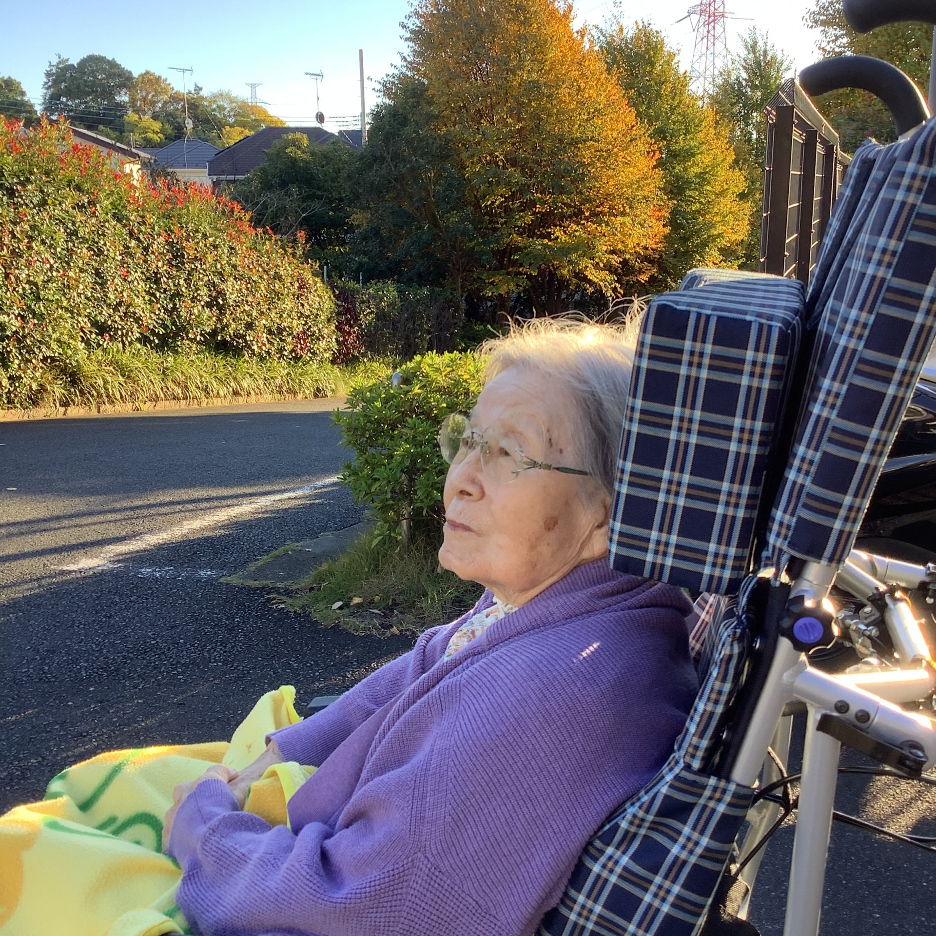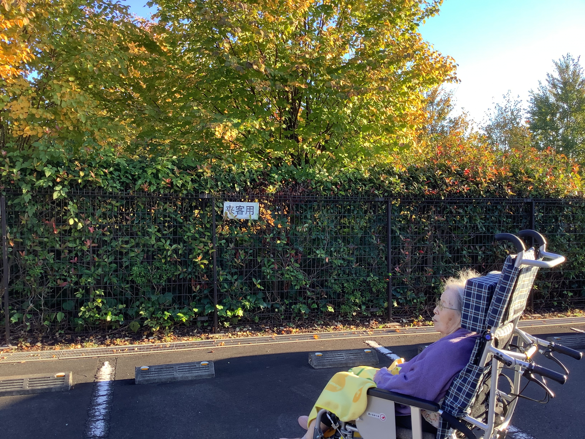 新鮮ない空気を吸って青空も眺めました。「畑もある、家もいっぱいね~~、紅葉綺麗だね~」お話しながら笑顔で過ごされました。少しでも気分転換できましたね〜。また散歩しましょう♪ありがとうございます♪