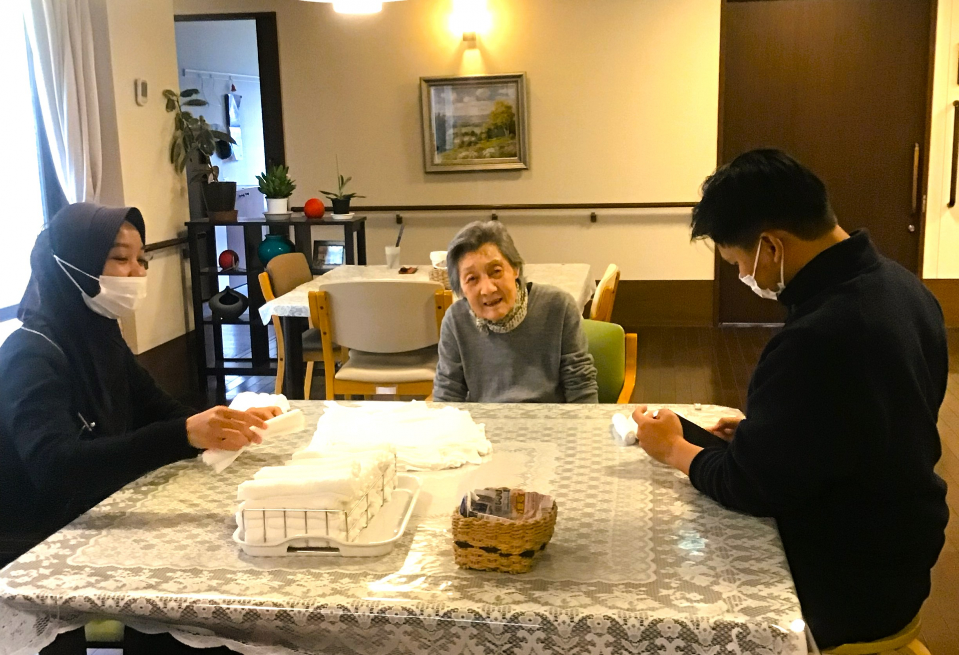 職員と一緒におしぼり巻きをして過ごされたり、