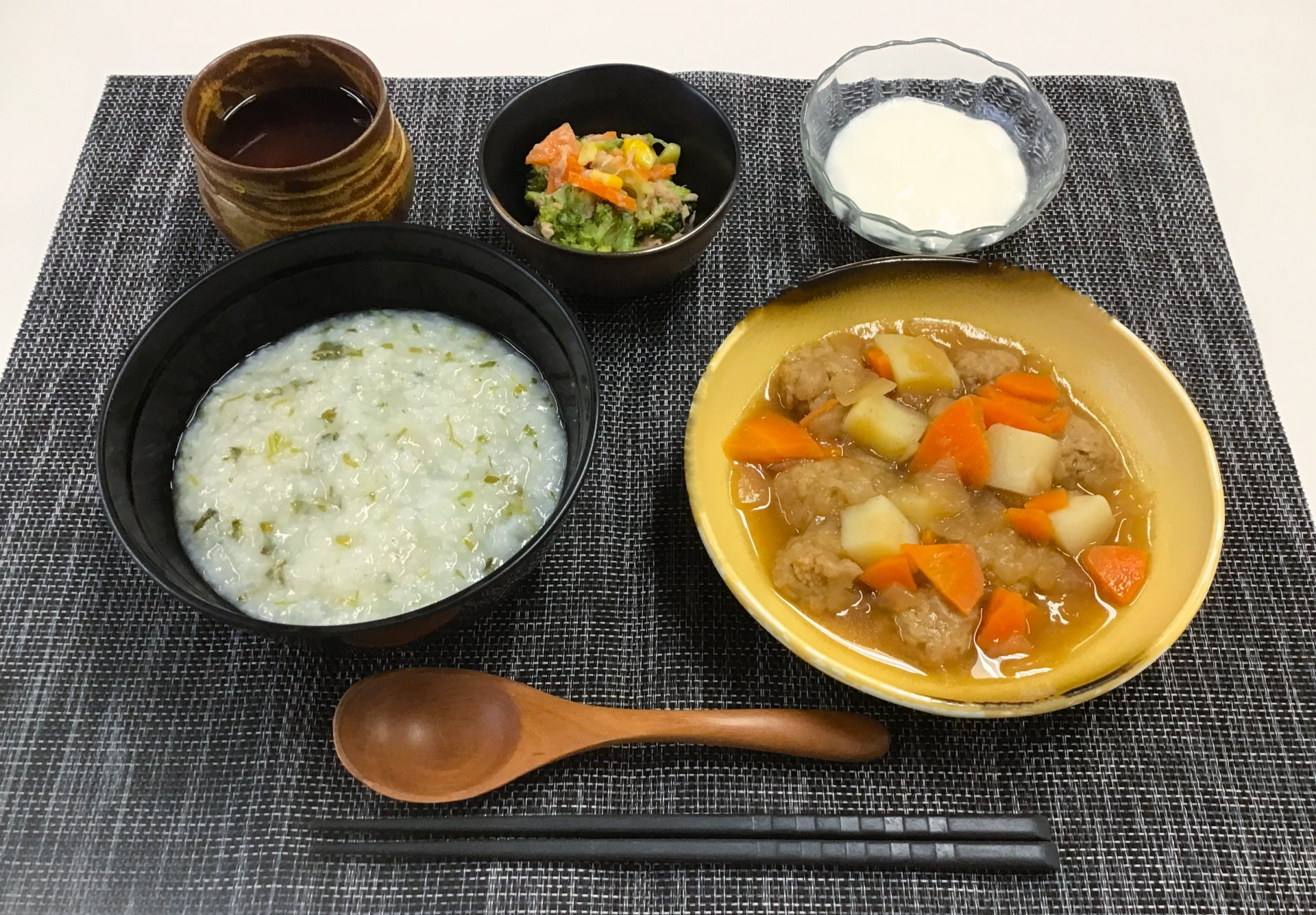 ◇七草がゆ、肉団子と野菜の炒め煮、ブロッコリーサラダ、りんごムース◇