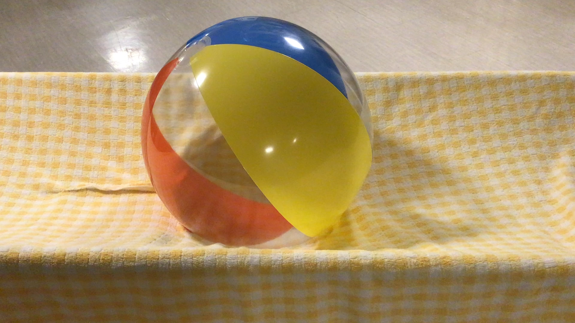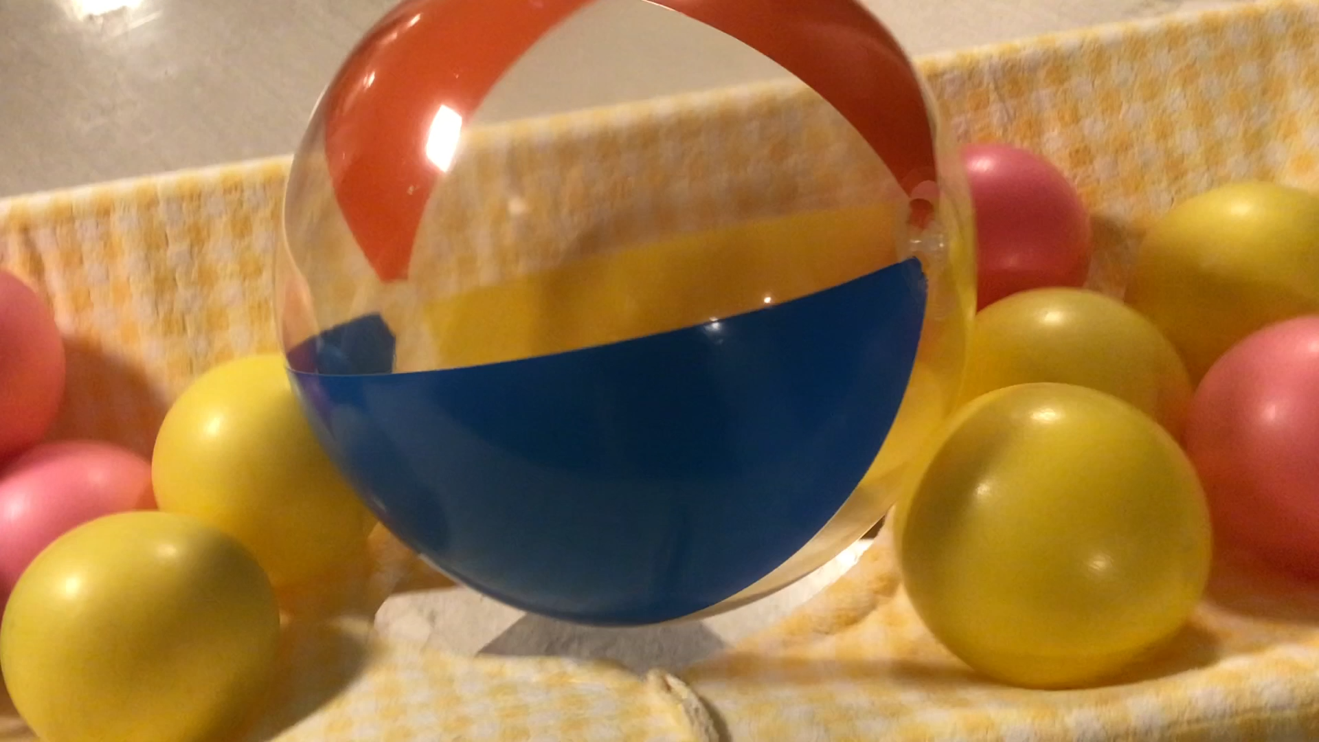 ビーチボールを穴から動かして小ボールを床に落としていきます。