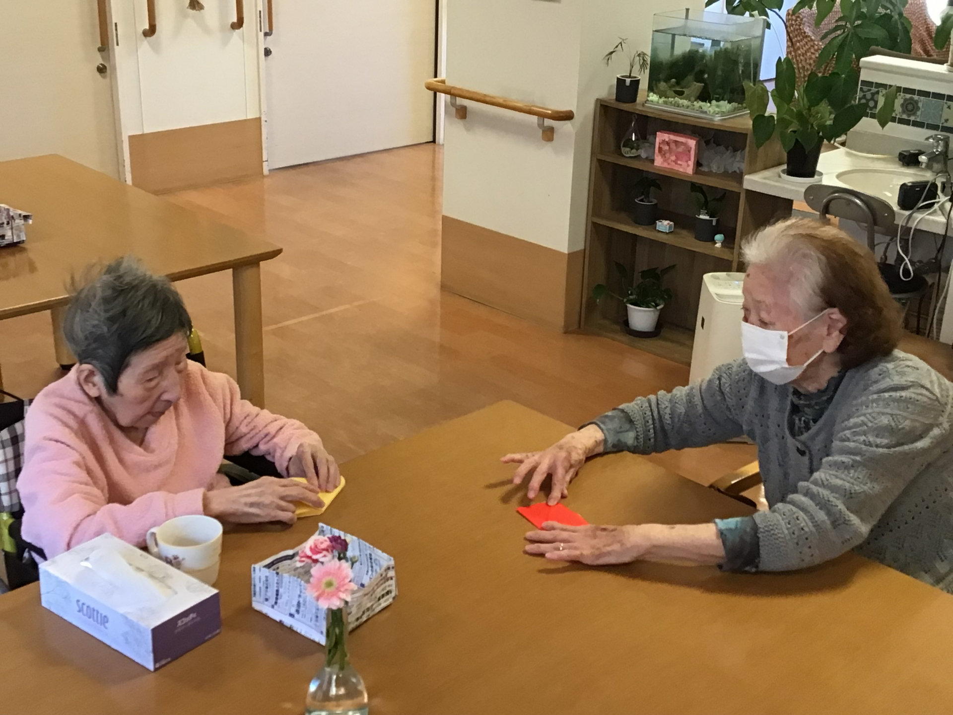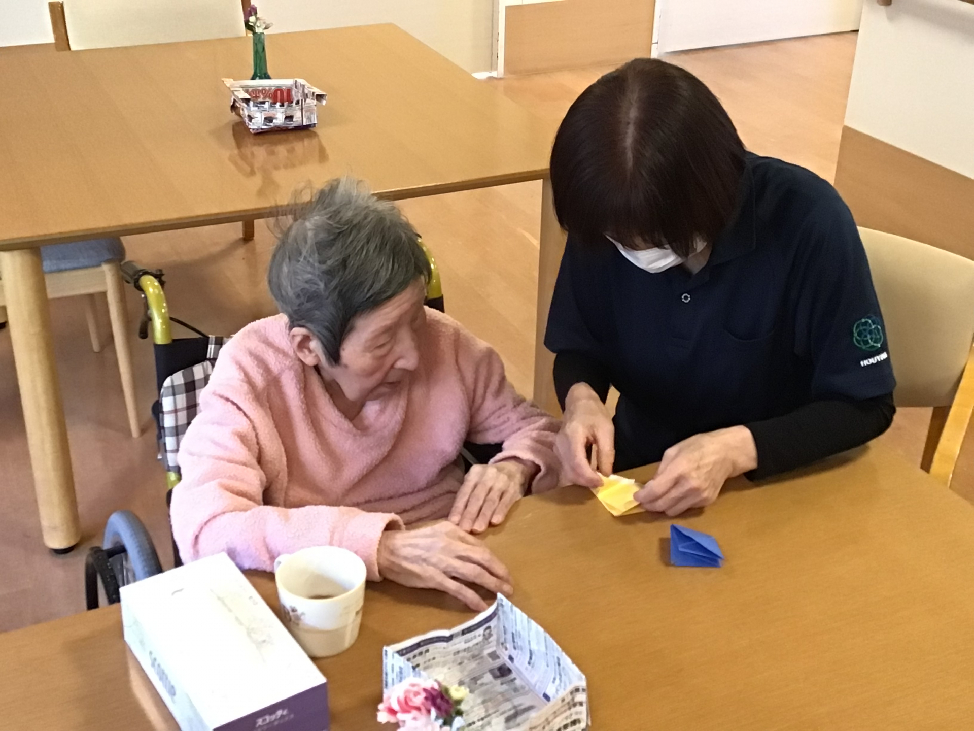 皆さんと折り紙で風船を折りました。「昔よく折っていたけど忘れちゃったわ」と少し不安気な様子でしたが、折り始めるとあちらこちらで「あーそうそう」と言う声が聞こえてきました♪作った後はうちわを羽子板がわりにして羽付きをしました。皆さんの笑い声を聞いて癒されました╰(*´︶`*)╯♡