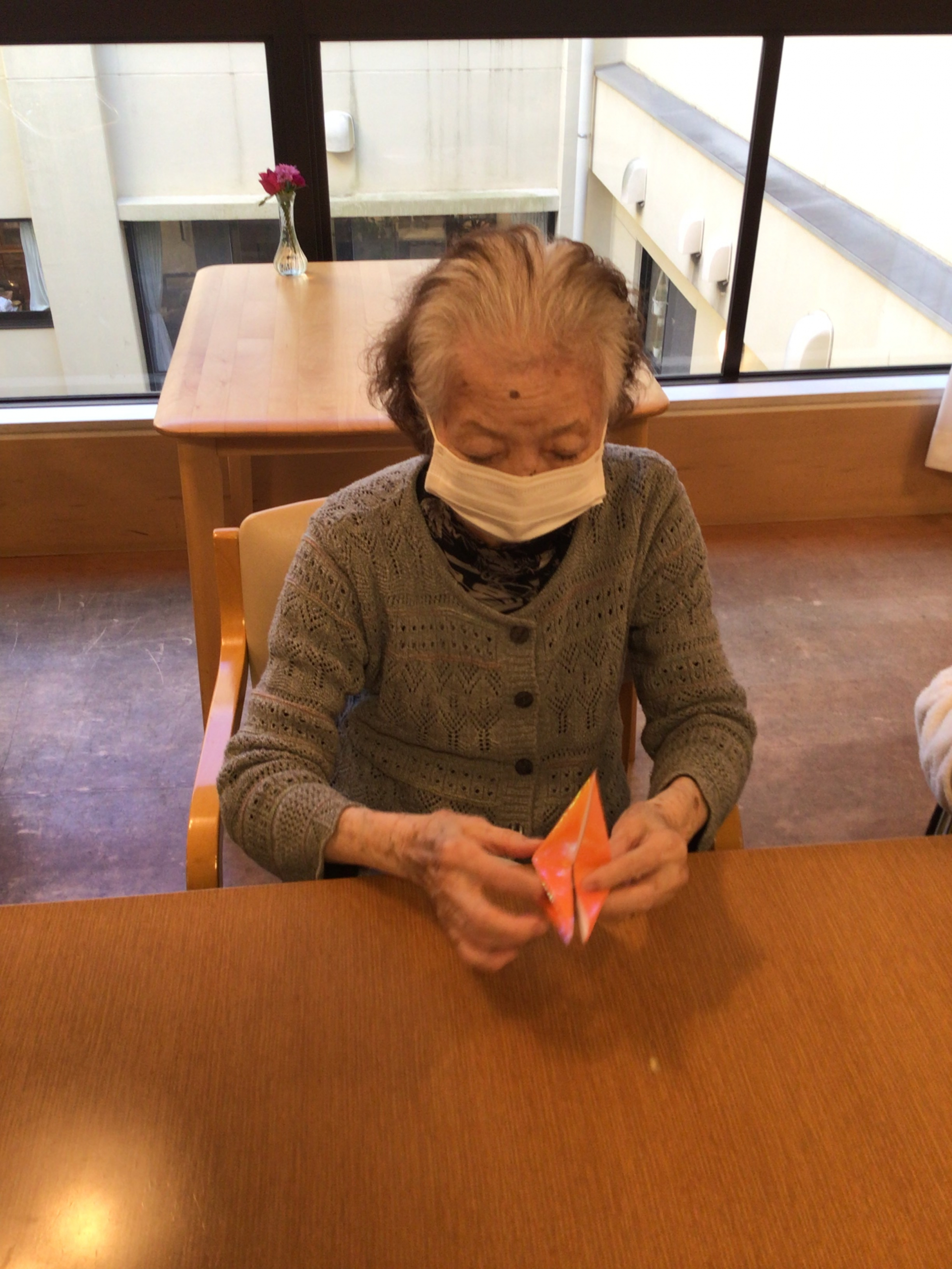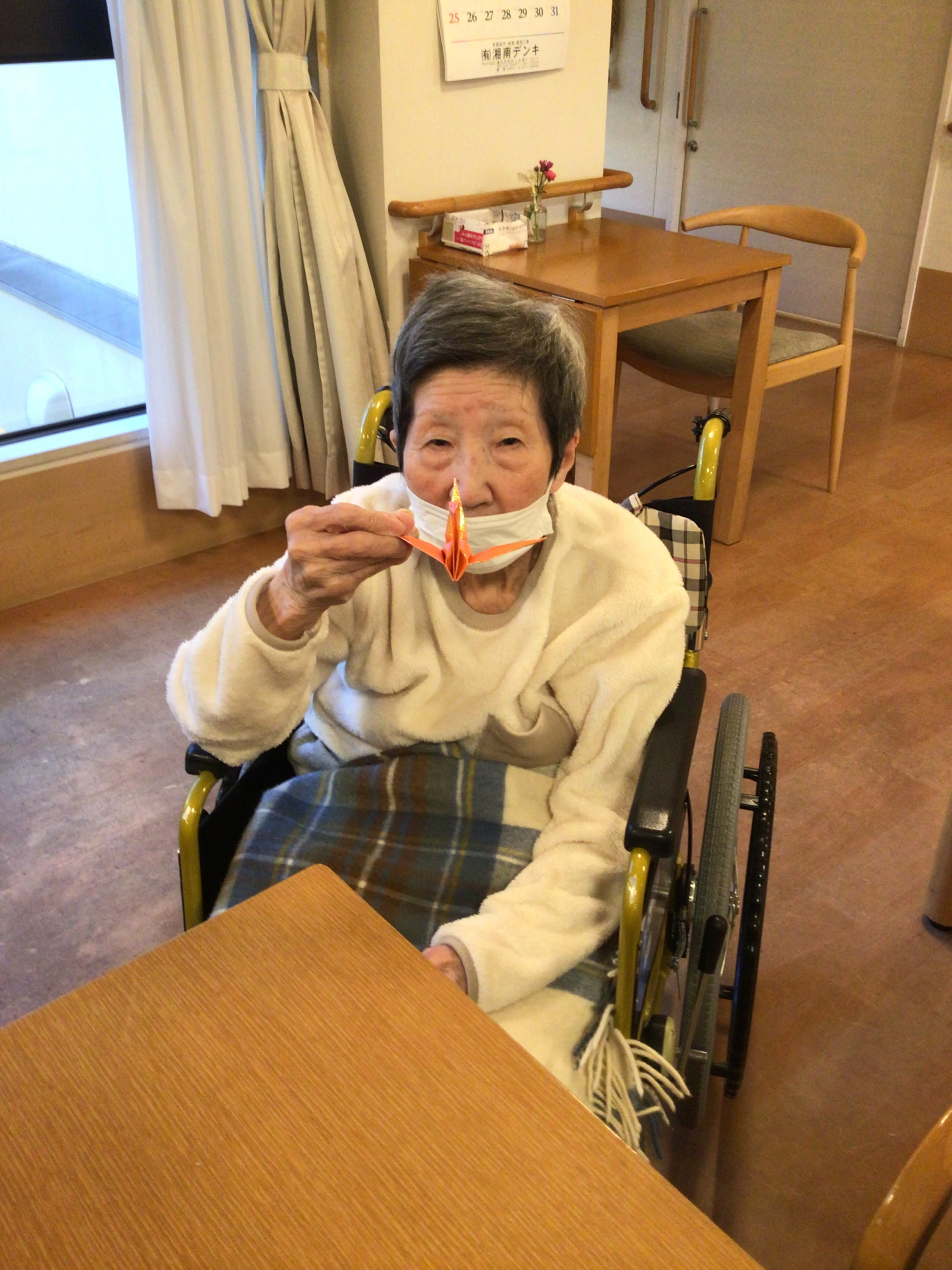 久しぶりに折り紙を皆さんで折りました。鶴を折リ始めると「昔はよく折っていたけど忘れちゃったわ」と言われながらも折っていくうちに思い出したかのように指先が自然と動いていました。最後は糸で吊るしてお部屋に飾りました♪ くすのきユニット D.M