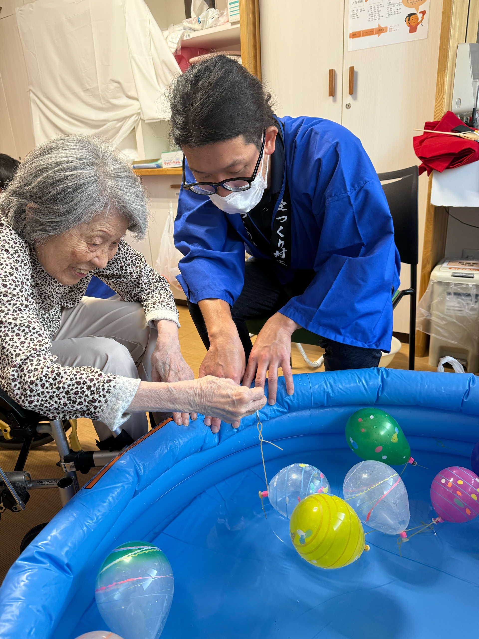 前日までにヨーヨーづくりや施設内の飾りつけ等の準備を済ませ、当日は職員総出で出し物対応やご利用者様の案内に当たりました。