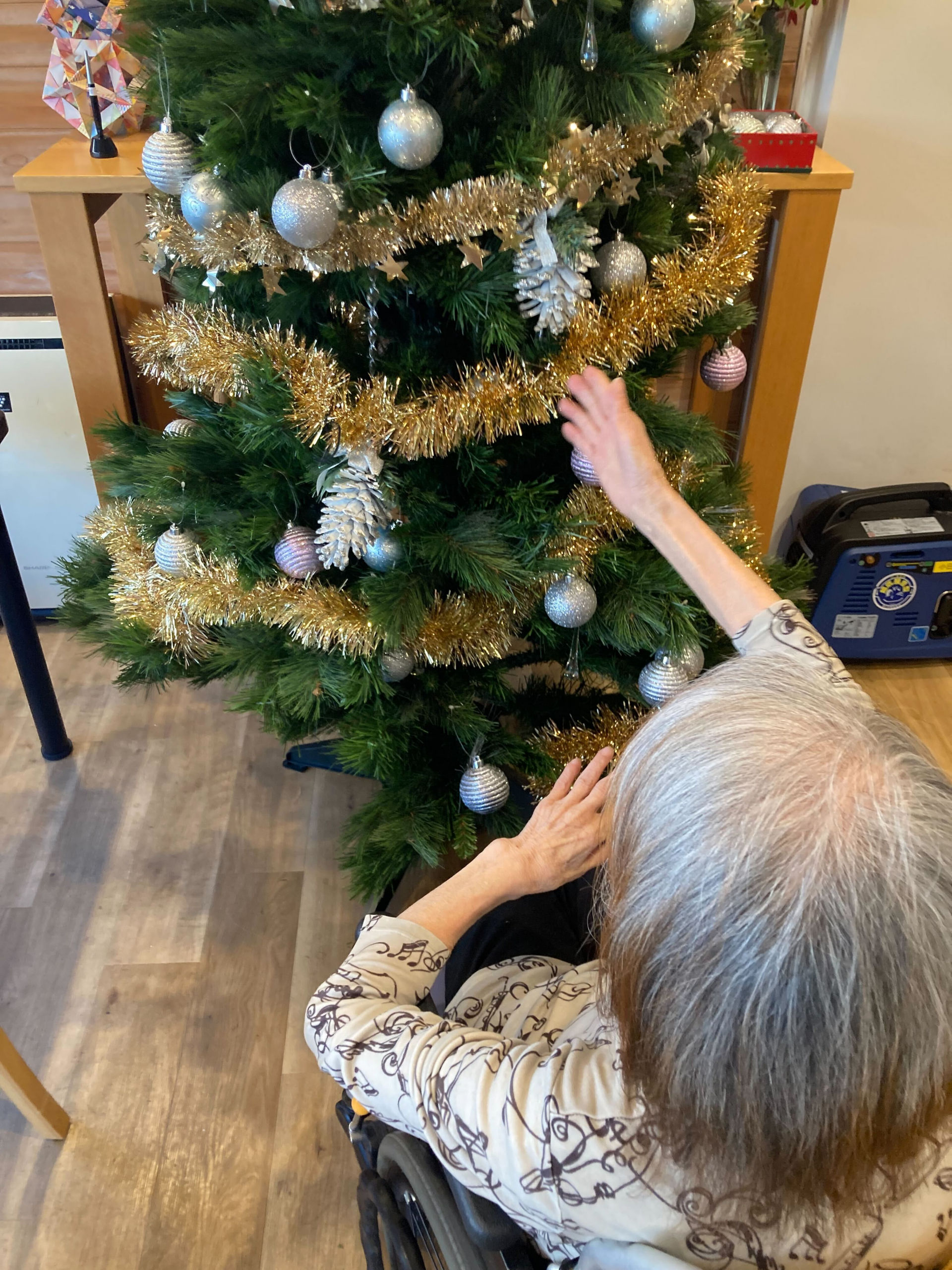 入居者の皆さまにもご参加いただき、キラキラしたオーナメントやベル、リボンなど、お好きな飾りを選んでひとつずつ丁寧にツリーへ飾っていただきました。