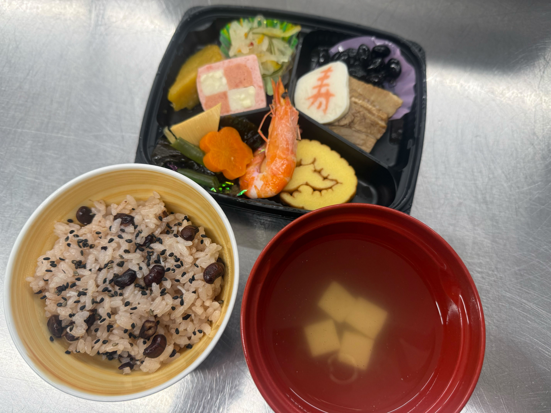 本日のお昼ご飯はおせちとお赤飯!