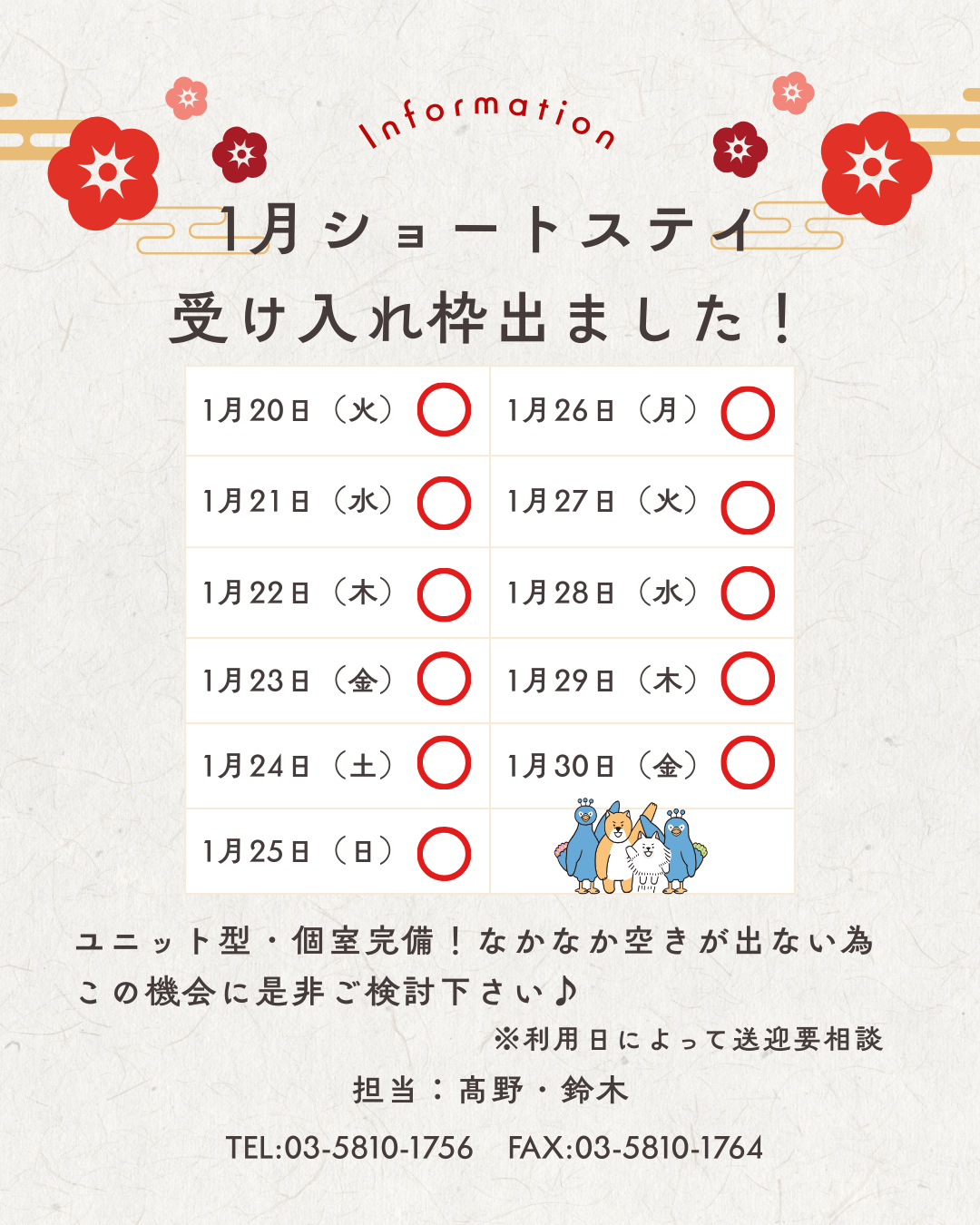 【ショートステイのお知らせ】1月空き枠出ました!お早目にご相談下さい♪