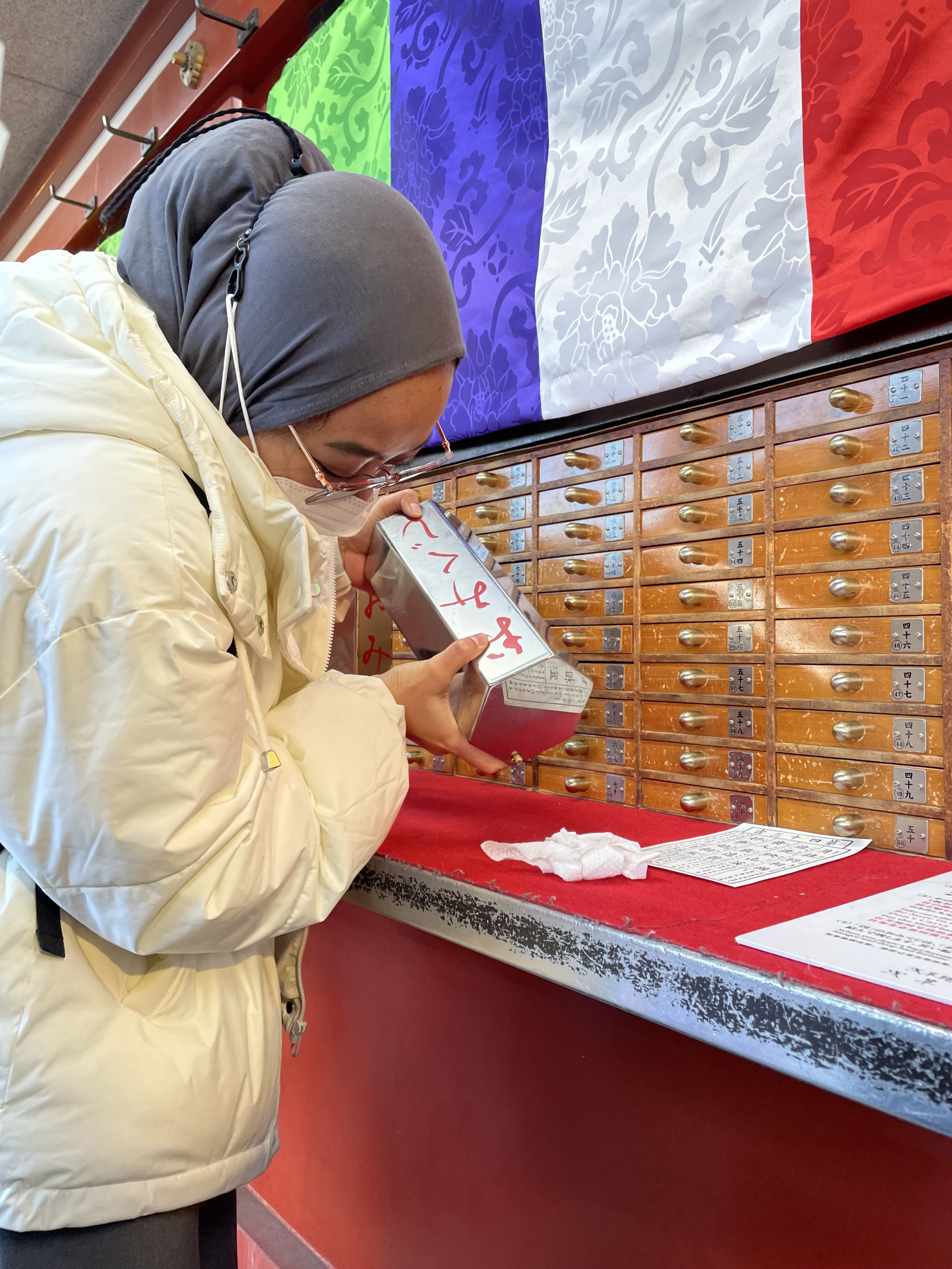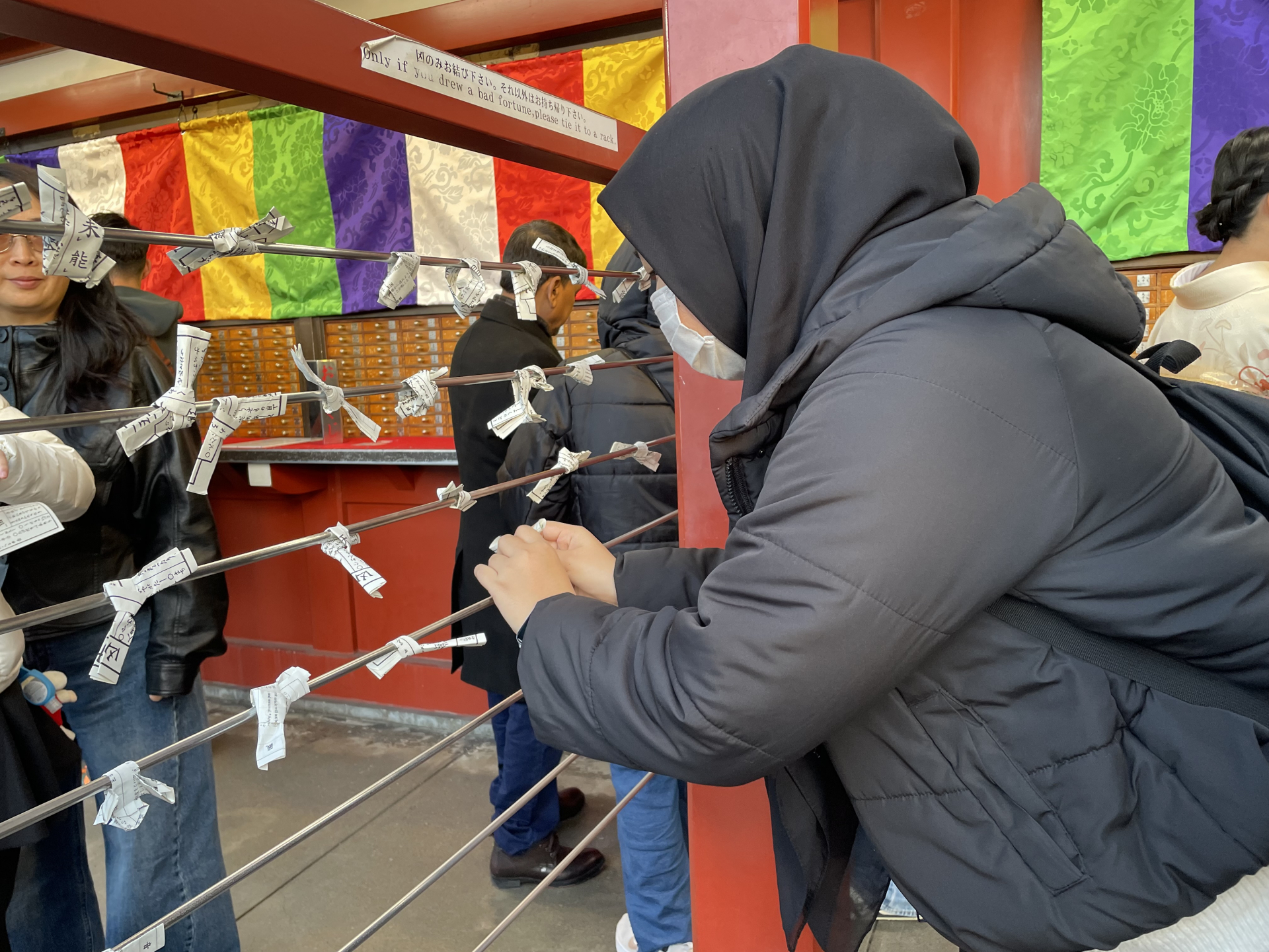 東京に着てまだ2日、浅草では珍しいものばかりで、おみくじや手水の手順など興味津々な様子