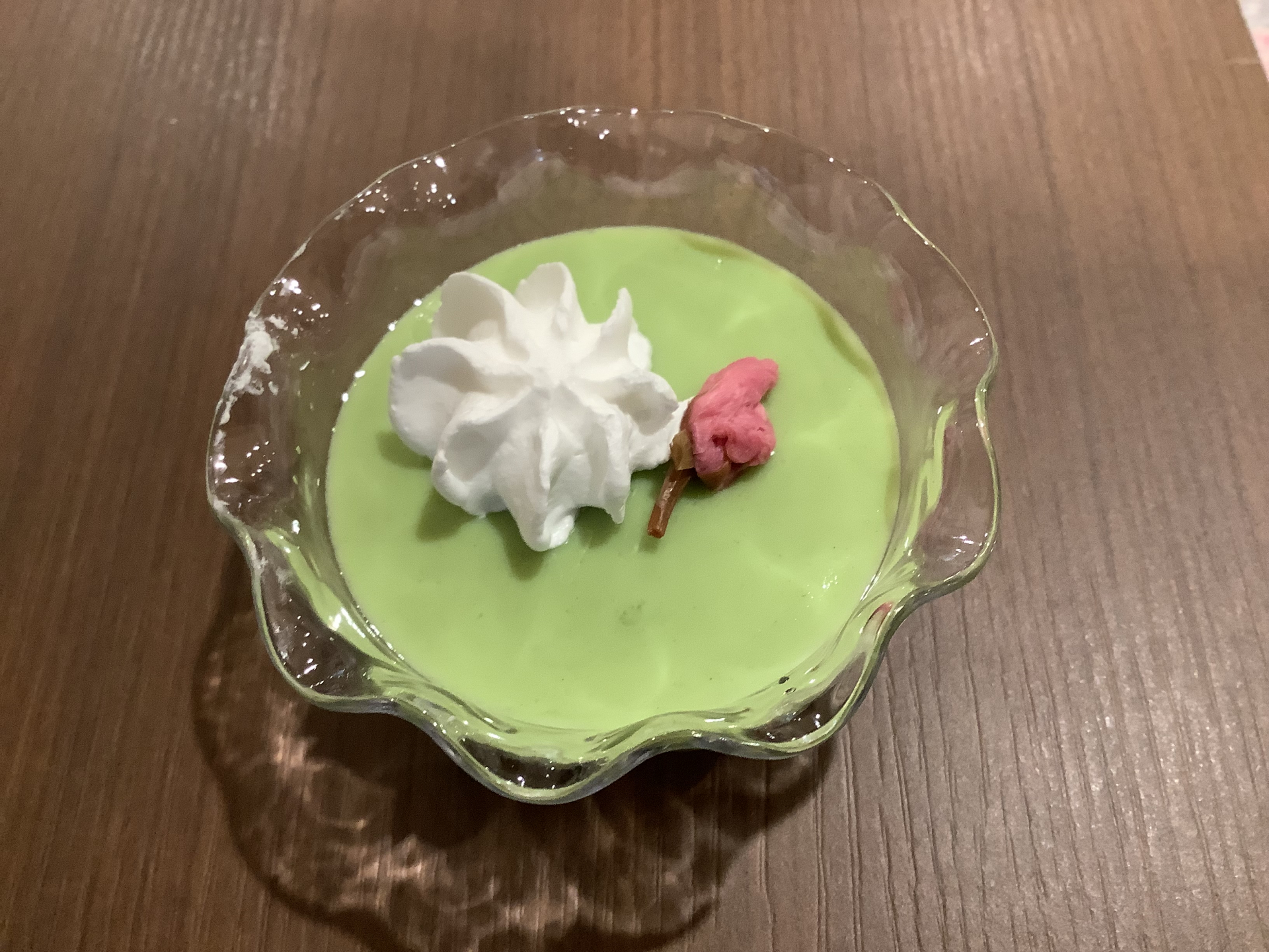 ↑デザートは、桜の塩漬けとホイップクリームが乗った、抹茶プリンです。