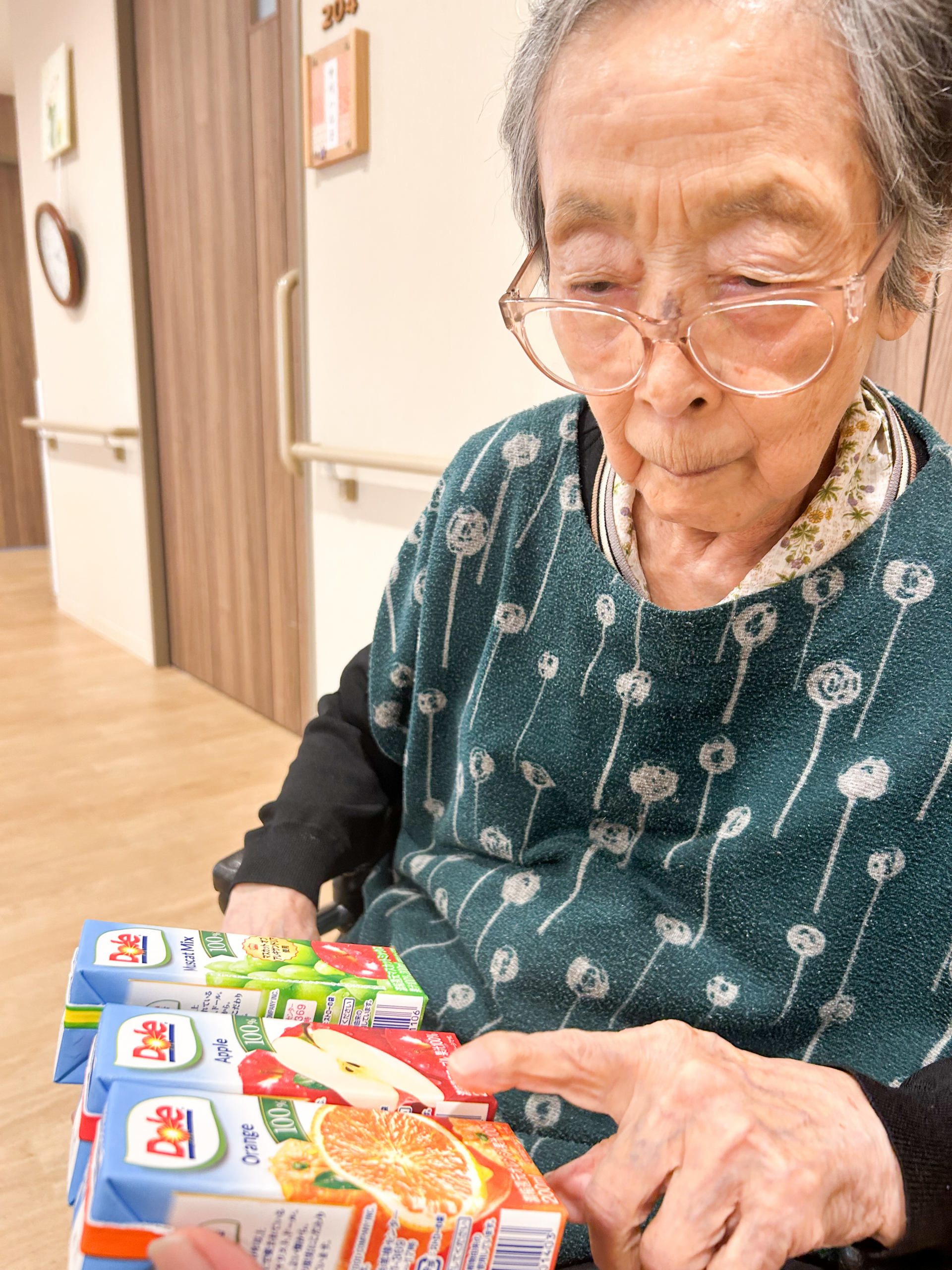 一緒に届いた果物と一緒にジュースを飲み「おいしいですよ、こんなたくさんいただいて!もうおなかいっぱいになっちゃう!」と笑顔でお話して下さりました(*^^*)