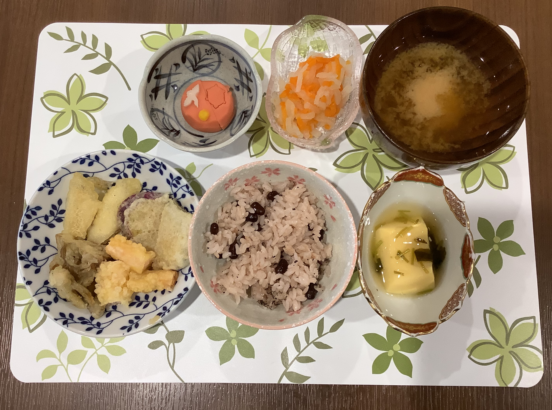 赤飯の華やかな彩りに、サクッと揚がった天ぷらを添えて。