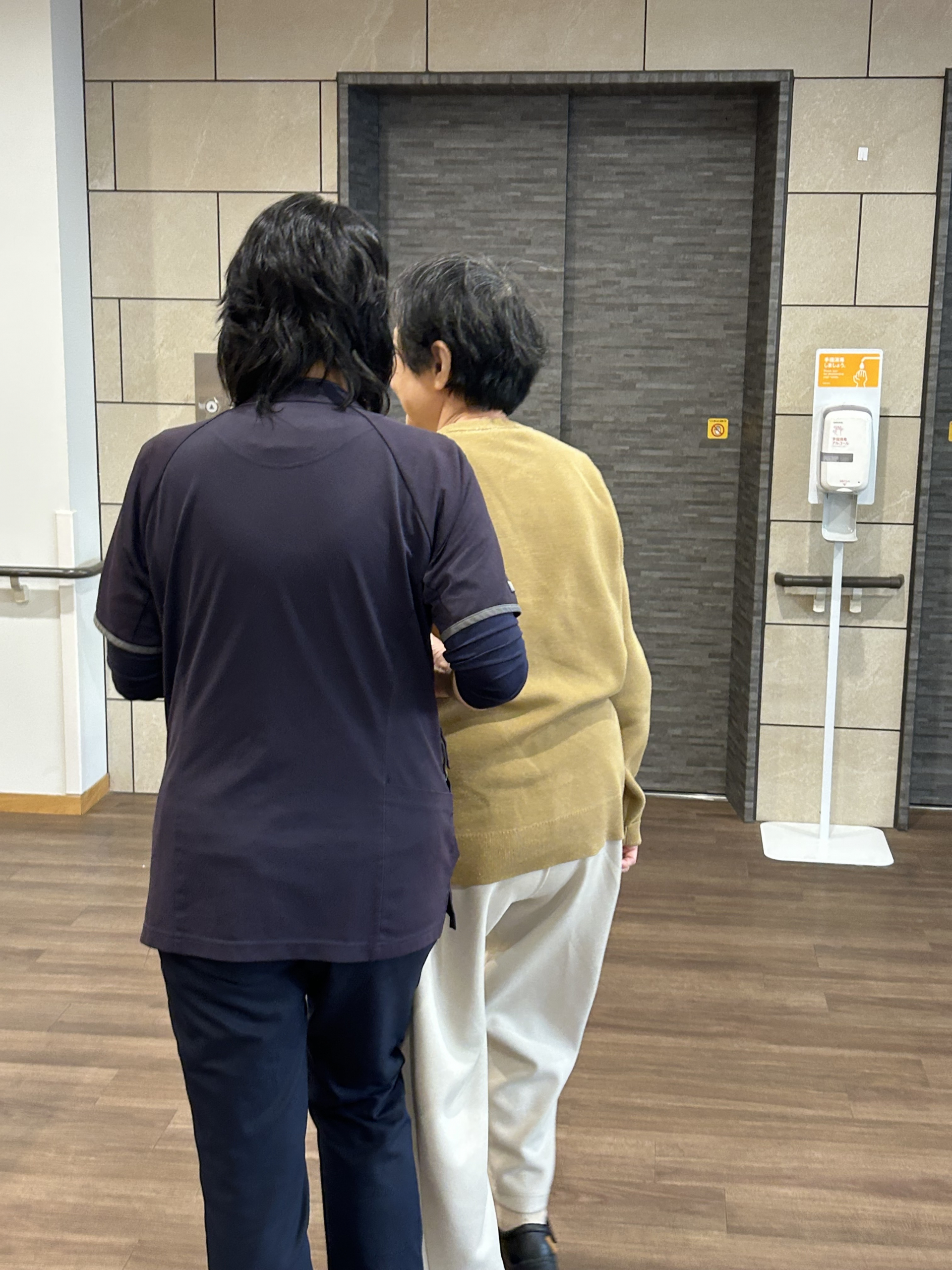 今日は、機能訓練指導員と施設の中をお散歩です。