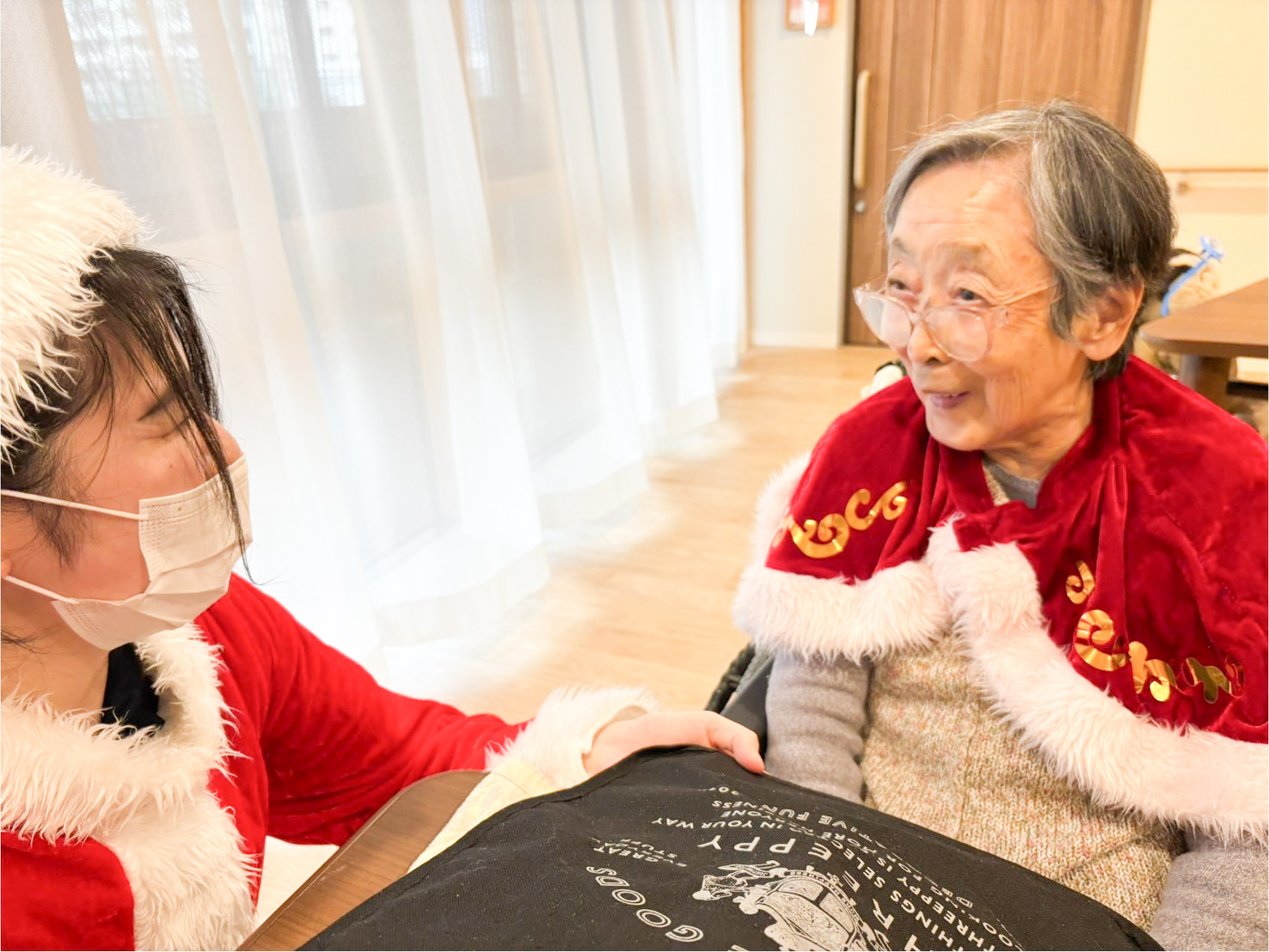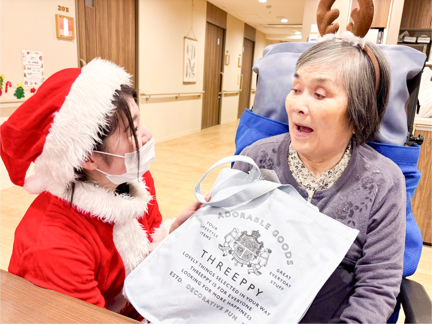 こちらの女性はまずはサンタの衣装を触って「サンタの衣装、すごく暖かそうだね~気持ちいいね」と笑っており、プレゼントがありますよとお伝えすると「え??プレゼントがあるの??」と驚かれていました。