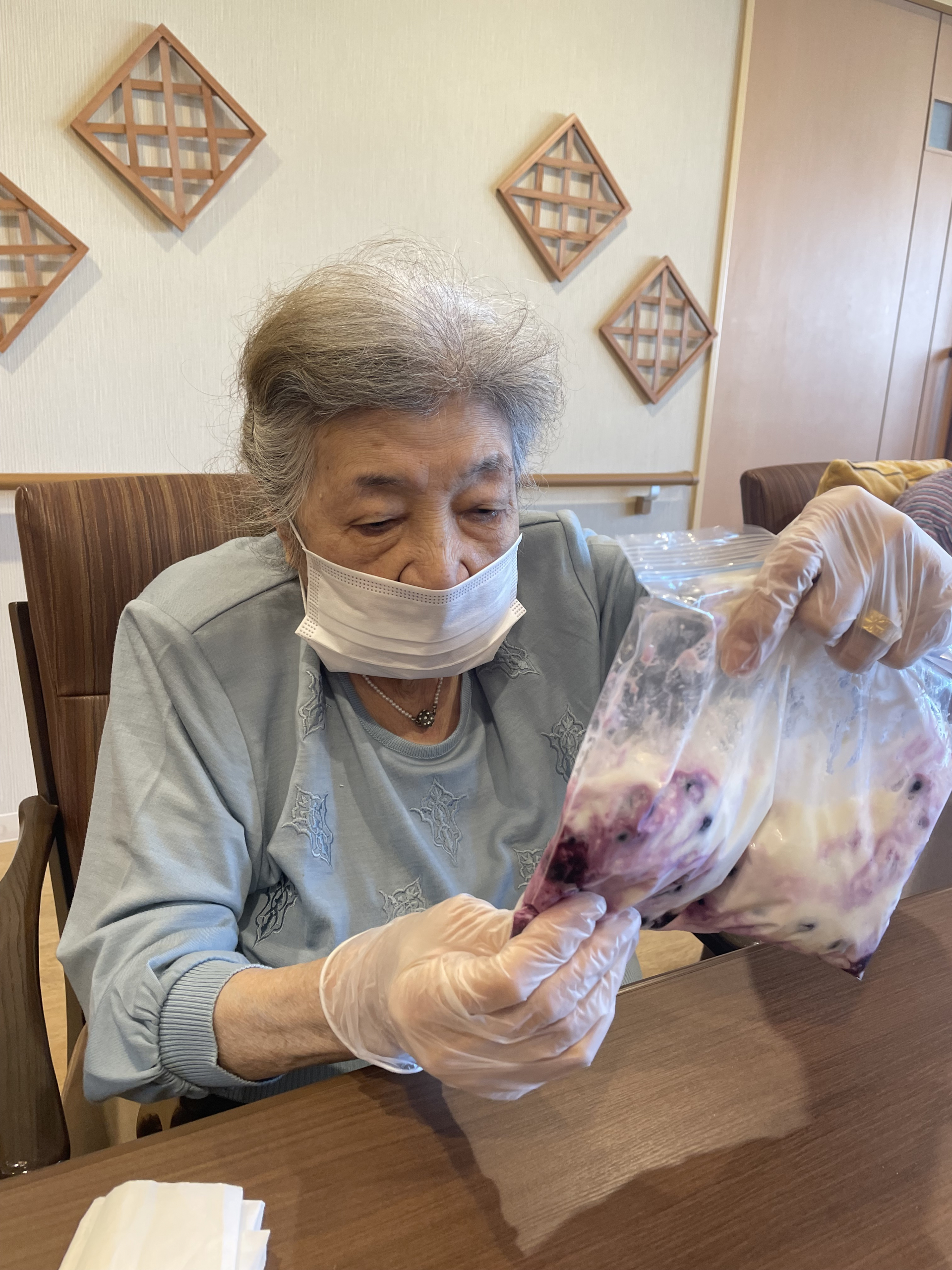 ブルーベリーをつぶしながらヨーグルトと混ぜ合わせる作業を利用者様には行っていただきました。