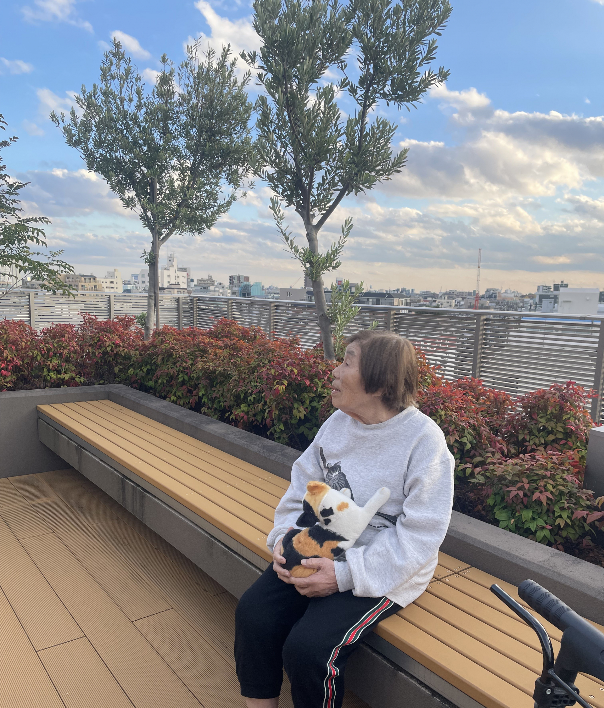 先日も屋上まで外気浴をしにいつも一緒の猫の人形も一緒に行かれました🐈