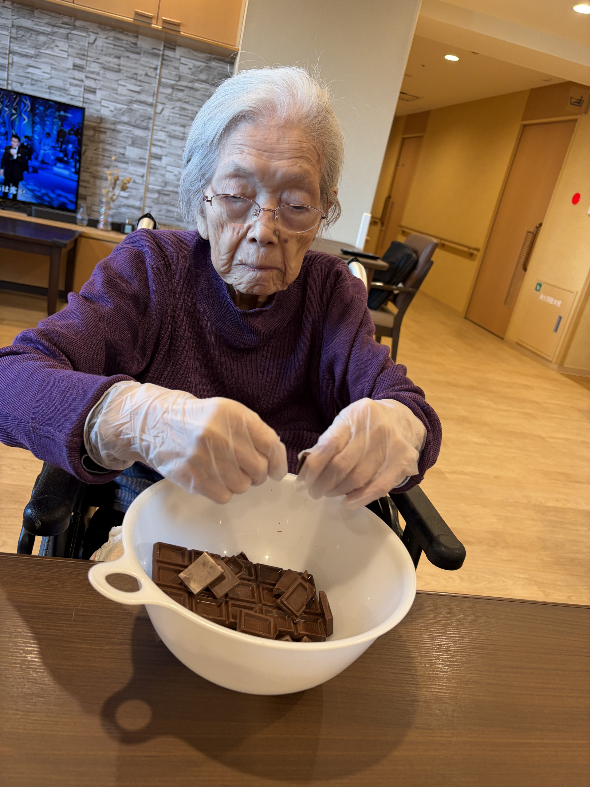 皆さんで協力して、材料のチョコレートを割っていただきました!