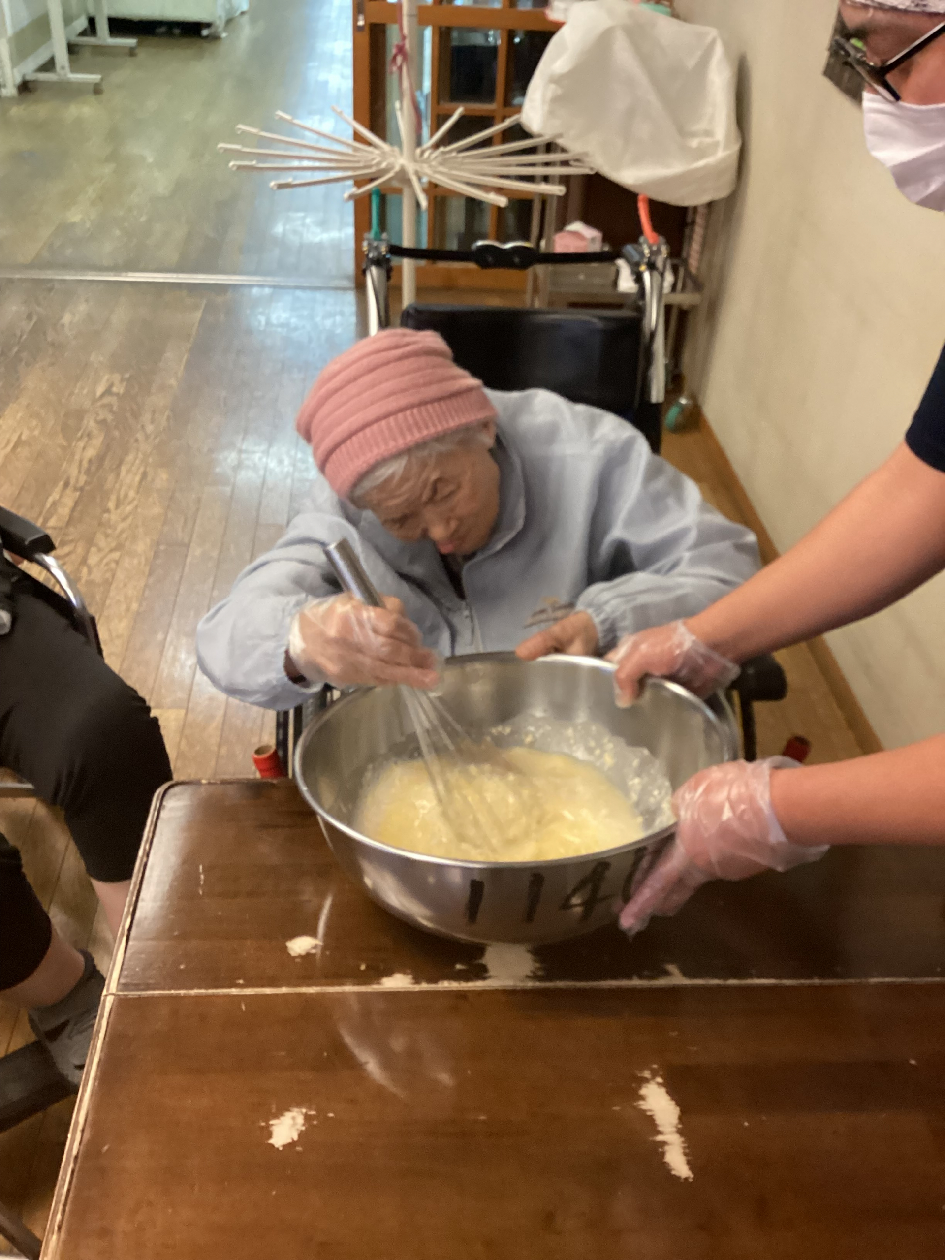 まずは生地をつくるため美味しくなれと気持ちを込めて皆様でかき混ぜました。
