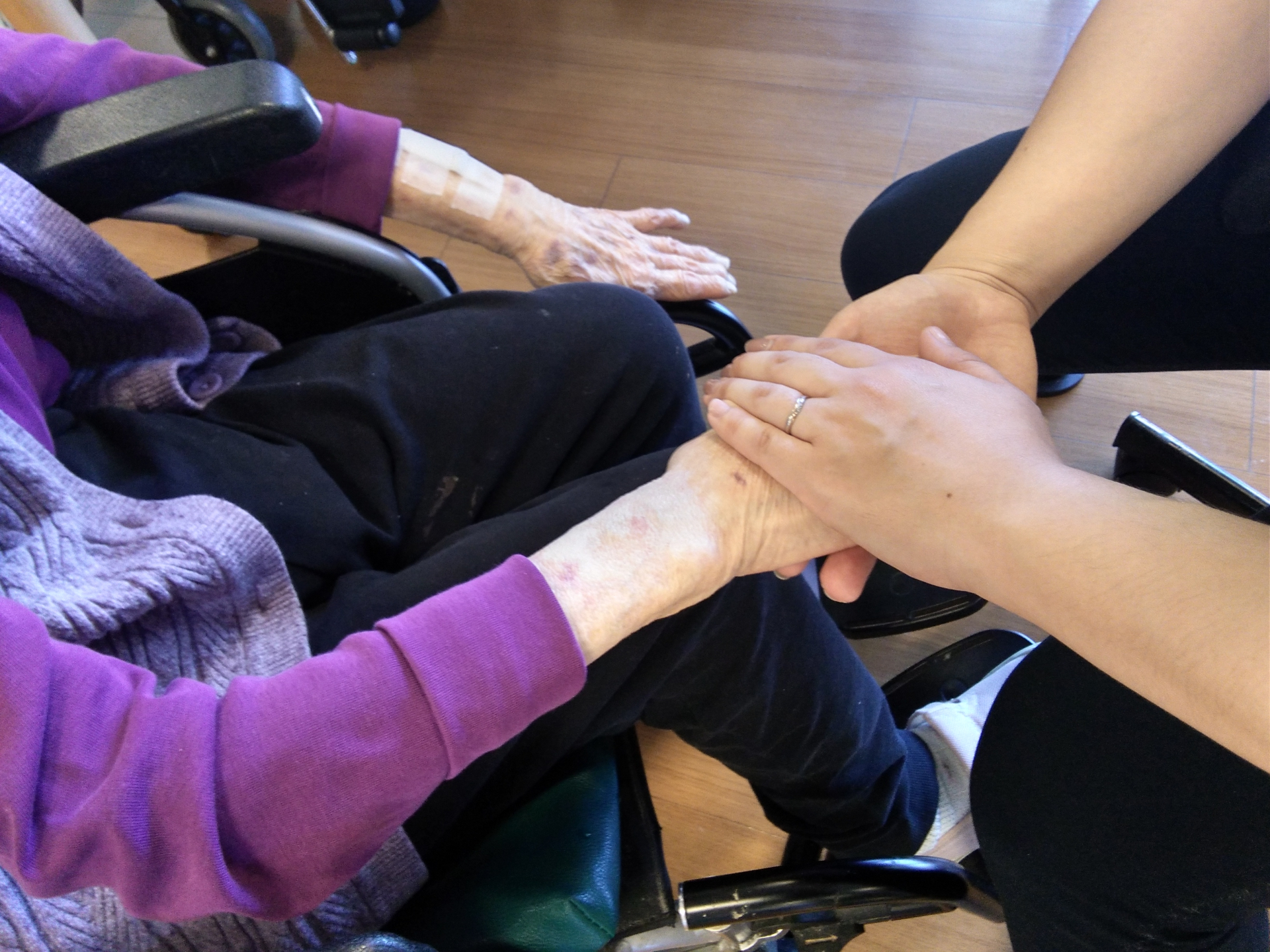 タクティールケアは手、足、背中と優しく触れるタッチケアで、認知症の方の不安な気持ちに寄り添ったり、