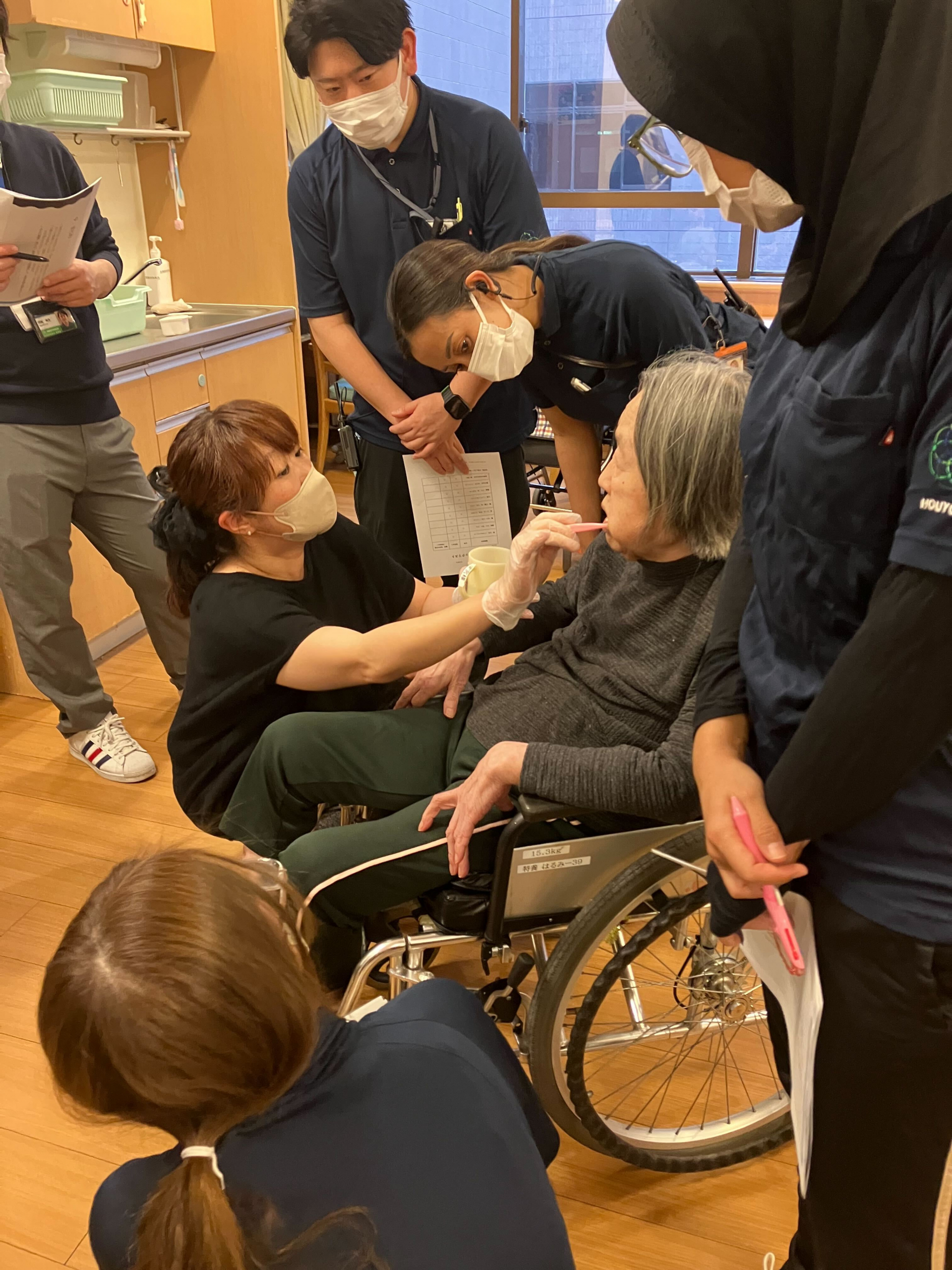 座学の後は実際にご入居者様にもご協力いただき、歯磨きの仕方について勉強しました。