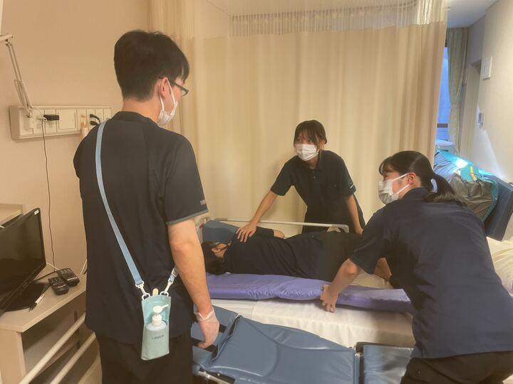 フレックスボードを使った移乗介助。ご利用者の安全安楽を最優先にベッドからリクライニングチェアに移って頂きます。