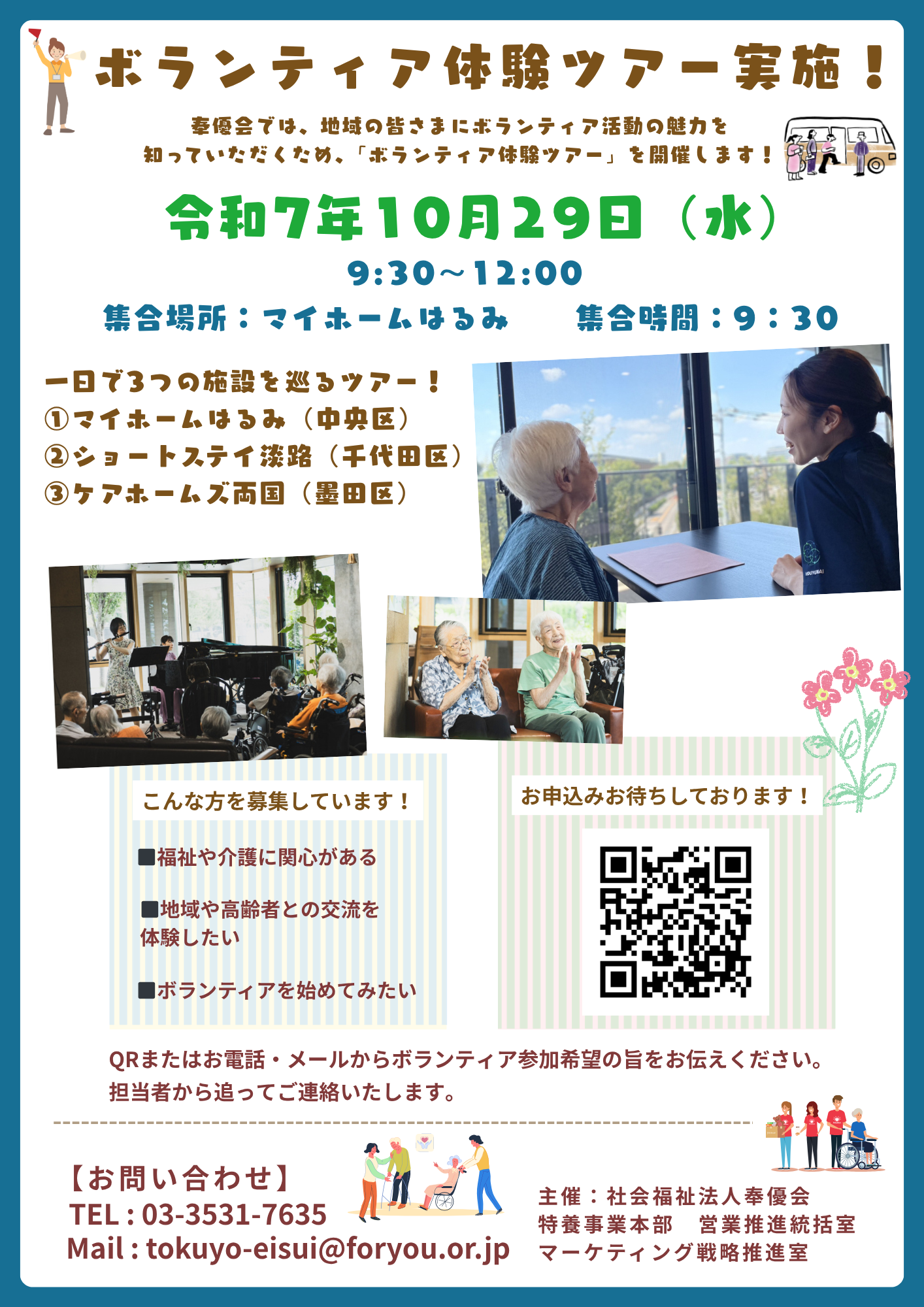 マイホームはるみ、フォーユーショートステイ淡路、ケアホームズ両国を周り、施設案内とボランティア体験ができます!