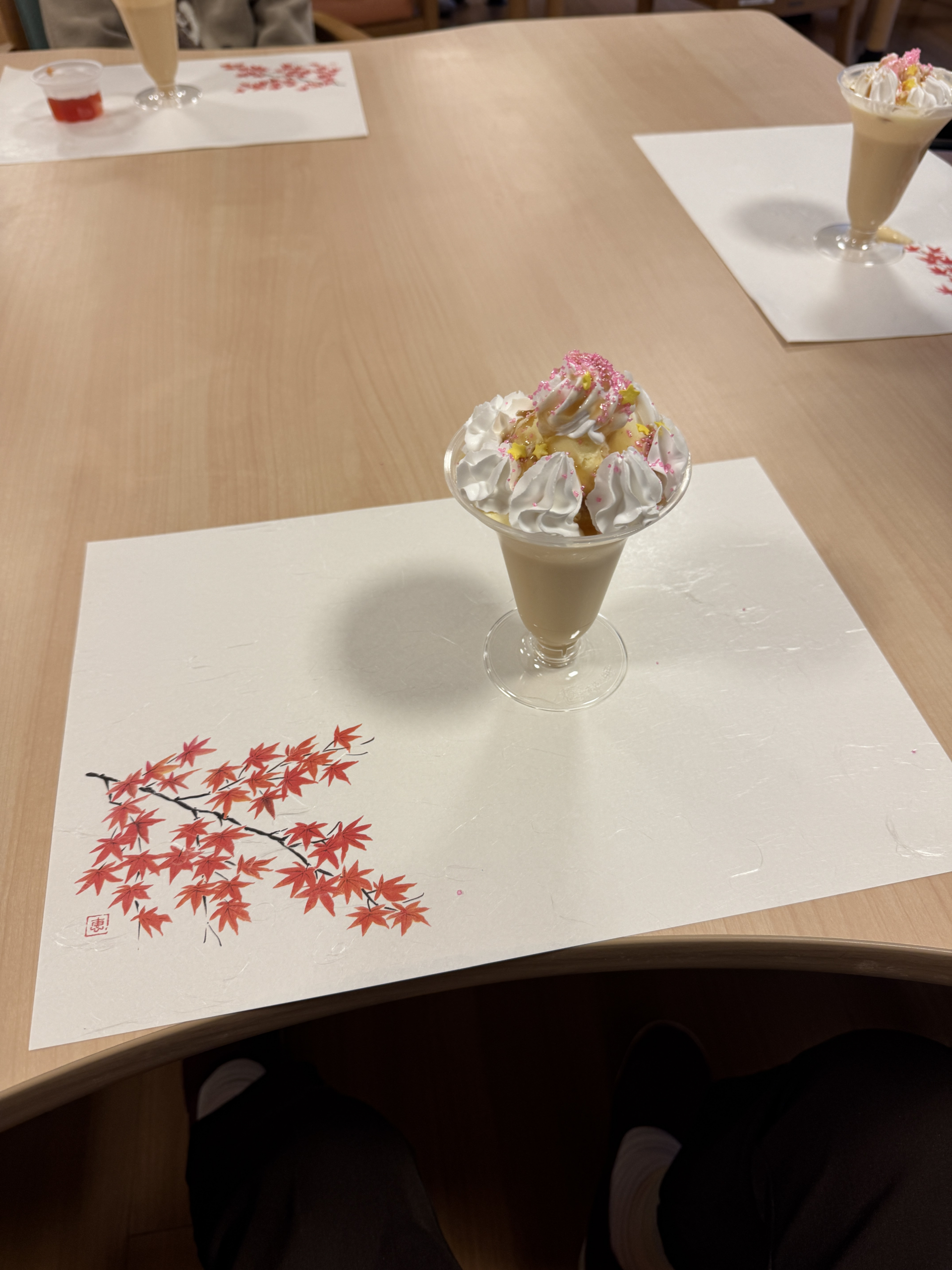 マロンババロアの上に牛乳プリン、キャラメルアイスにホイップ、トッピングをいたしました!
