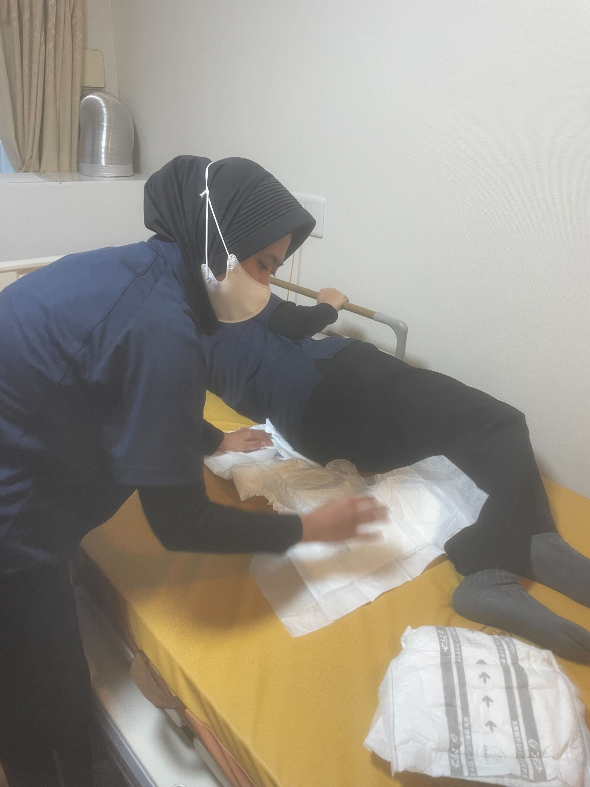 排泄ケアの演習の中で介護を受ける側の気持ちの理解や、より心地よく過ごして頂けるような手技も学びます。