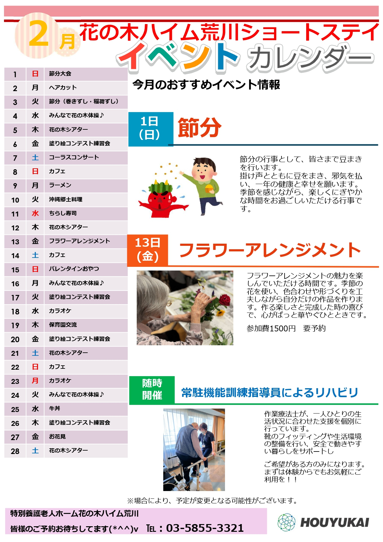 特養ショートステイ 2月イベントカレンダー(足立区、荒川区、文京区)