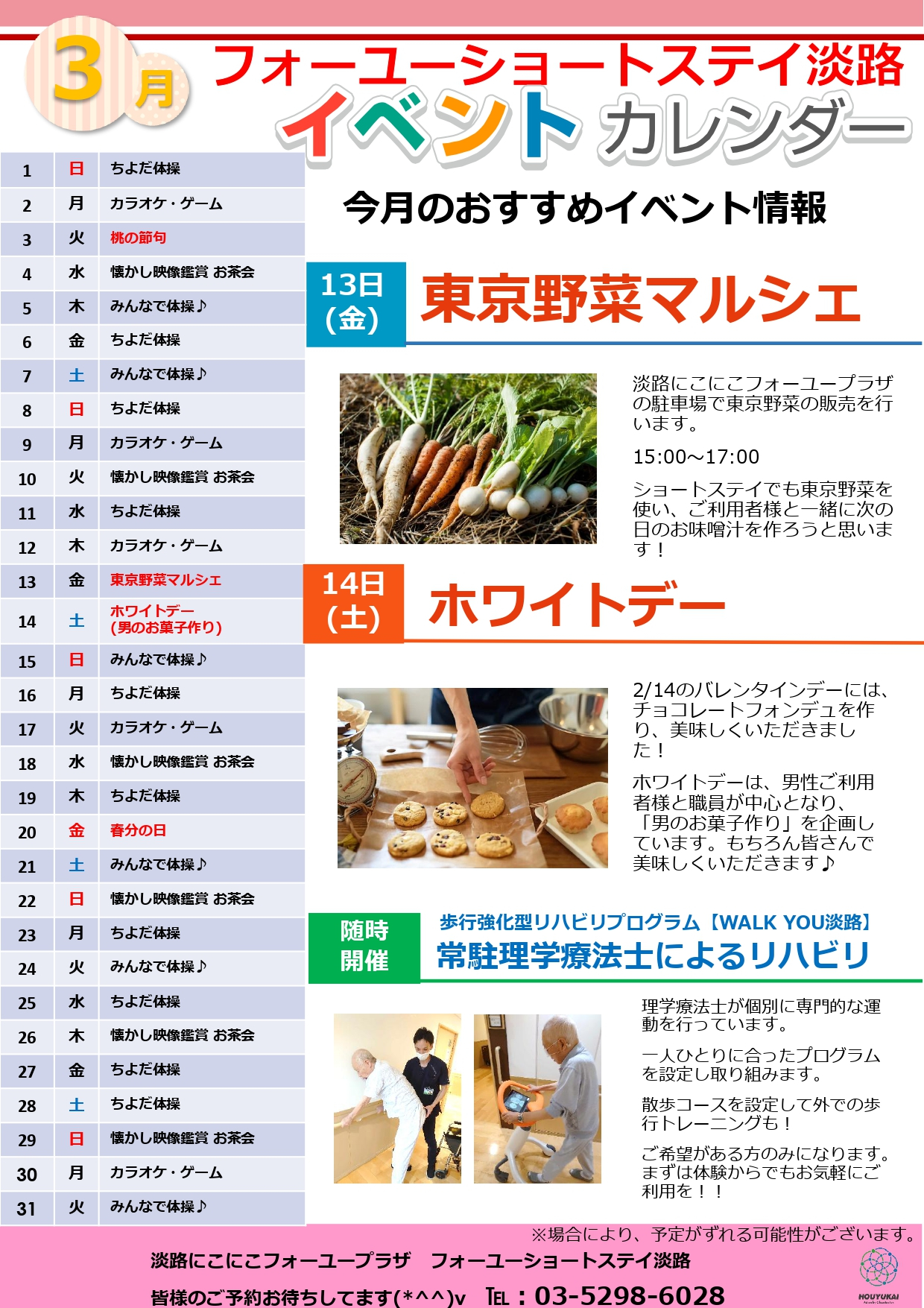 2026.02.26 お知らせ 特養ショートステイ 3月イベントカレンダー(中央区、千代田区) Tweet シェアする 当施設の特別養護老人ホームおよびショートステイでは、季節を感じながら楽しくお過ごしいただけるよう、毎月さまざまなイベントやレクリエーションを実施しております。このたび、3月のイベントカレンダーが完成しましたのでお知らせいたします。※イベント内容は状況により変更となる場合がございます。あらかじめご了承ください。 ■マイホームはるみ(中央区) ■淡路(千代田区) 一覧へ戻る