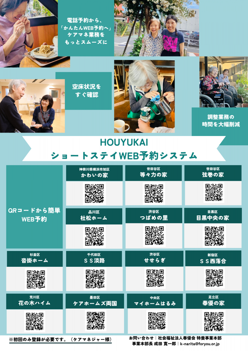 2026.03.31 ニュース 【new】ショートステイのWEB予約を、 4月1日より開始いたします。 Tweet シェアする ショートステイのWEB予約を、4月1日より開始いたします。 空き状況の確認・申込みがWEBで完結します。ご利用にあたっては、初回のみ新規登録が必要です。 迅速な受入調整にも対応いたしますので、ぜひご活用ください。 ▼QRコード・WEB予約はこちら 一覧へ戻る