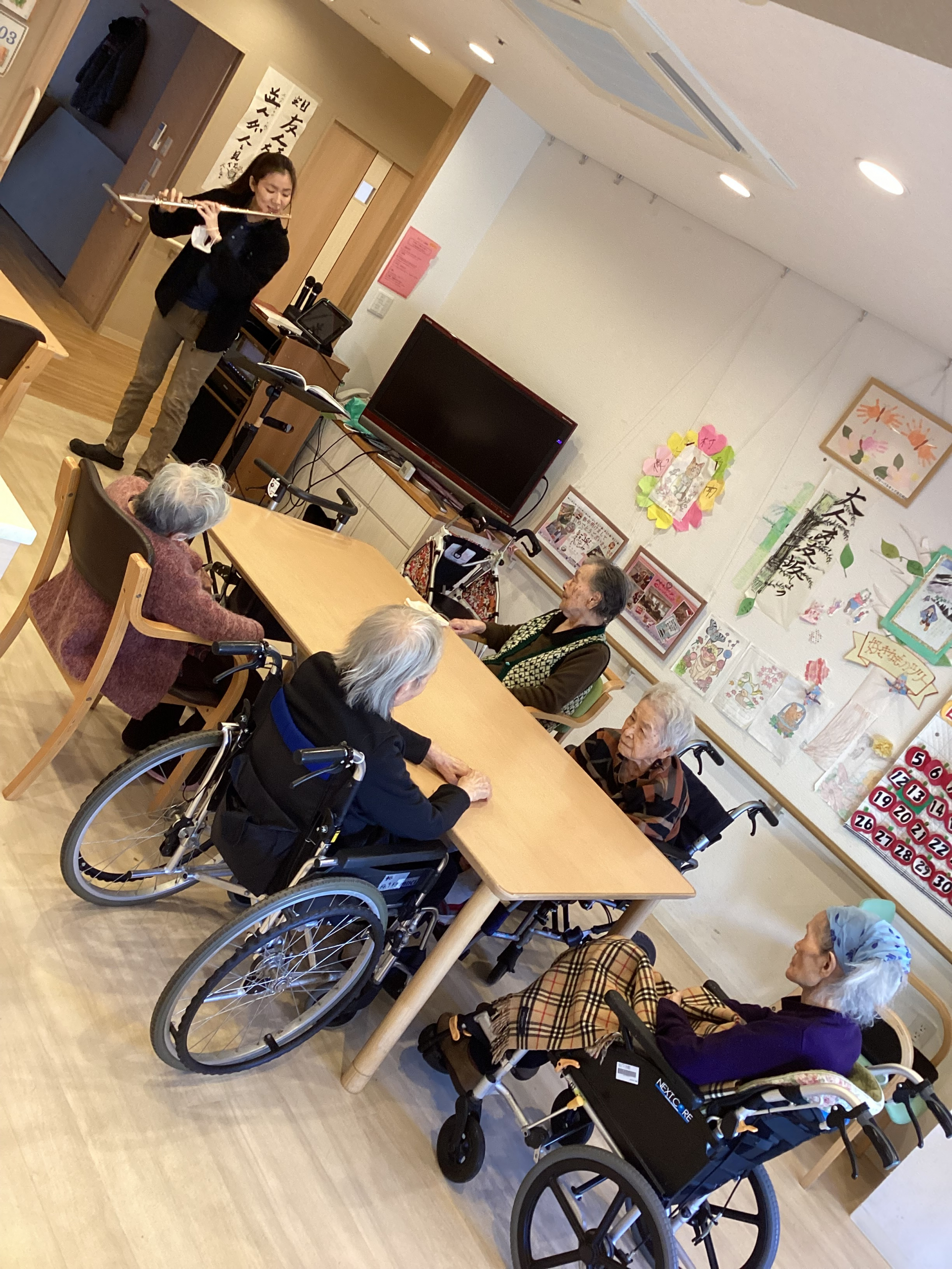 本日は皆様大好きフルート演奏の日。童謡や、歌謡曲、「ペチカ」など演奏していただきました。