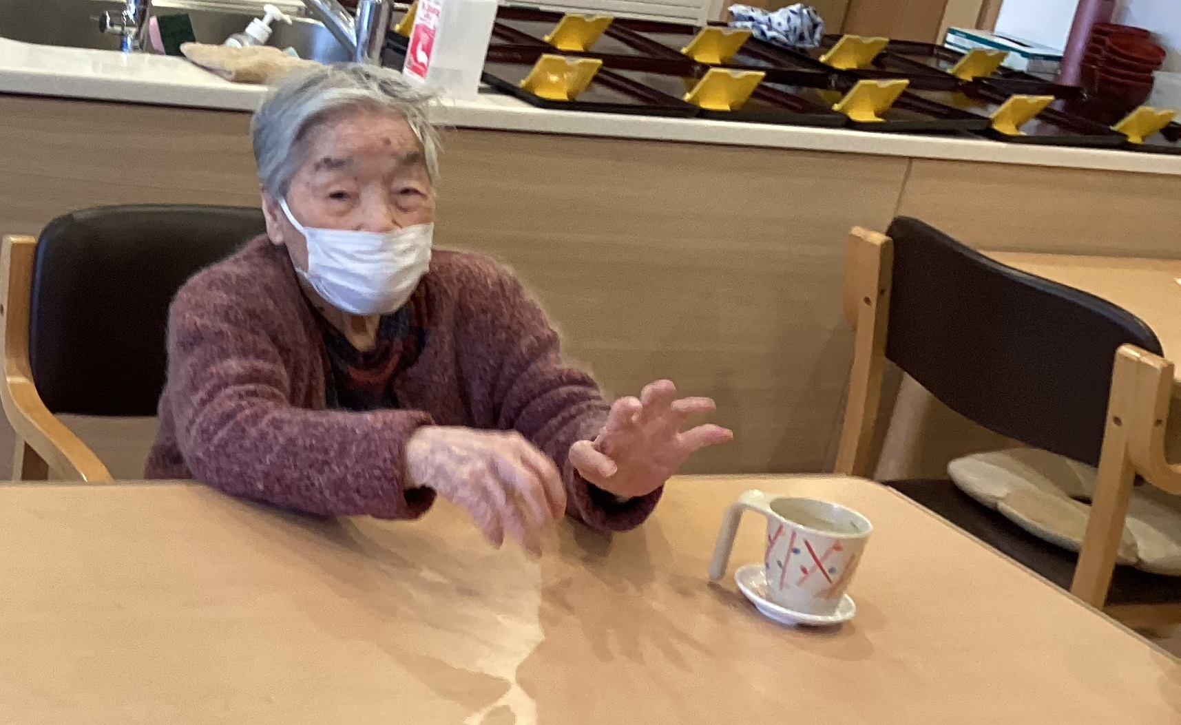 フルート演奏の後は体操を、手をパタパタ。「滅多に身体を動かさなくなっちゃったけど、いざ動かすと気持ちいわね~」と仰り体操を頑張っておられました。