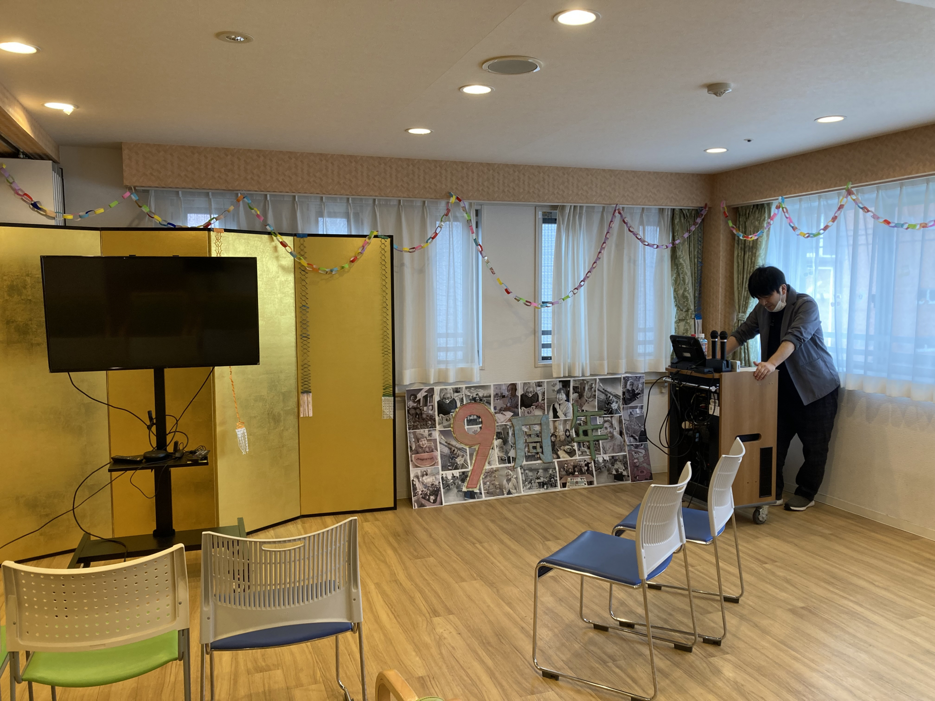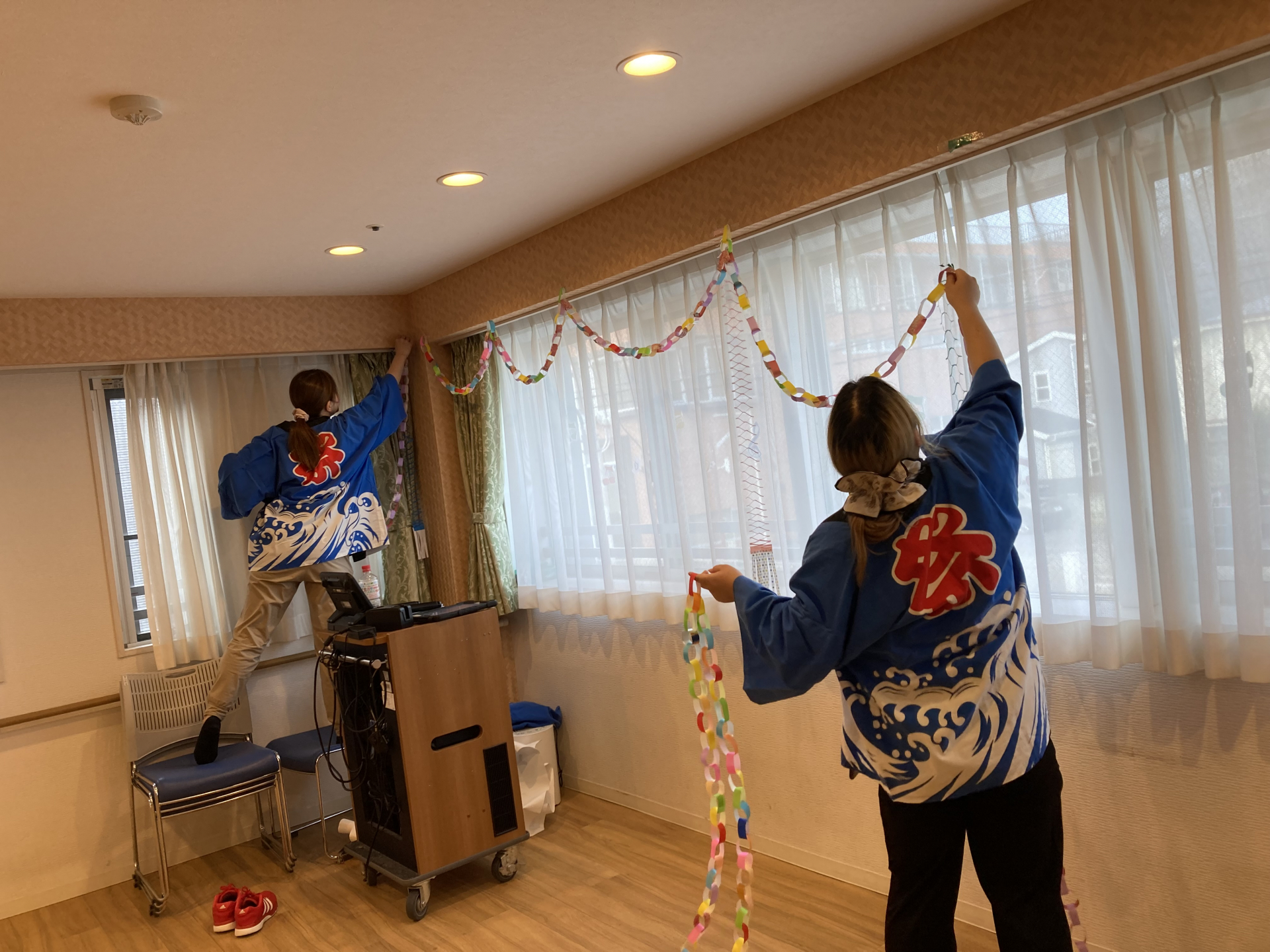 職員と利用者様とで、会場の飾りつけを行いました。