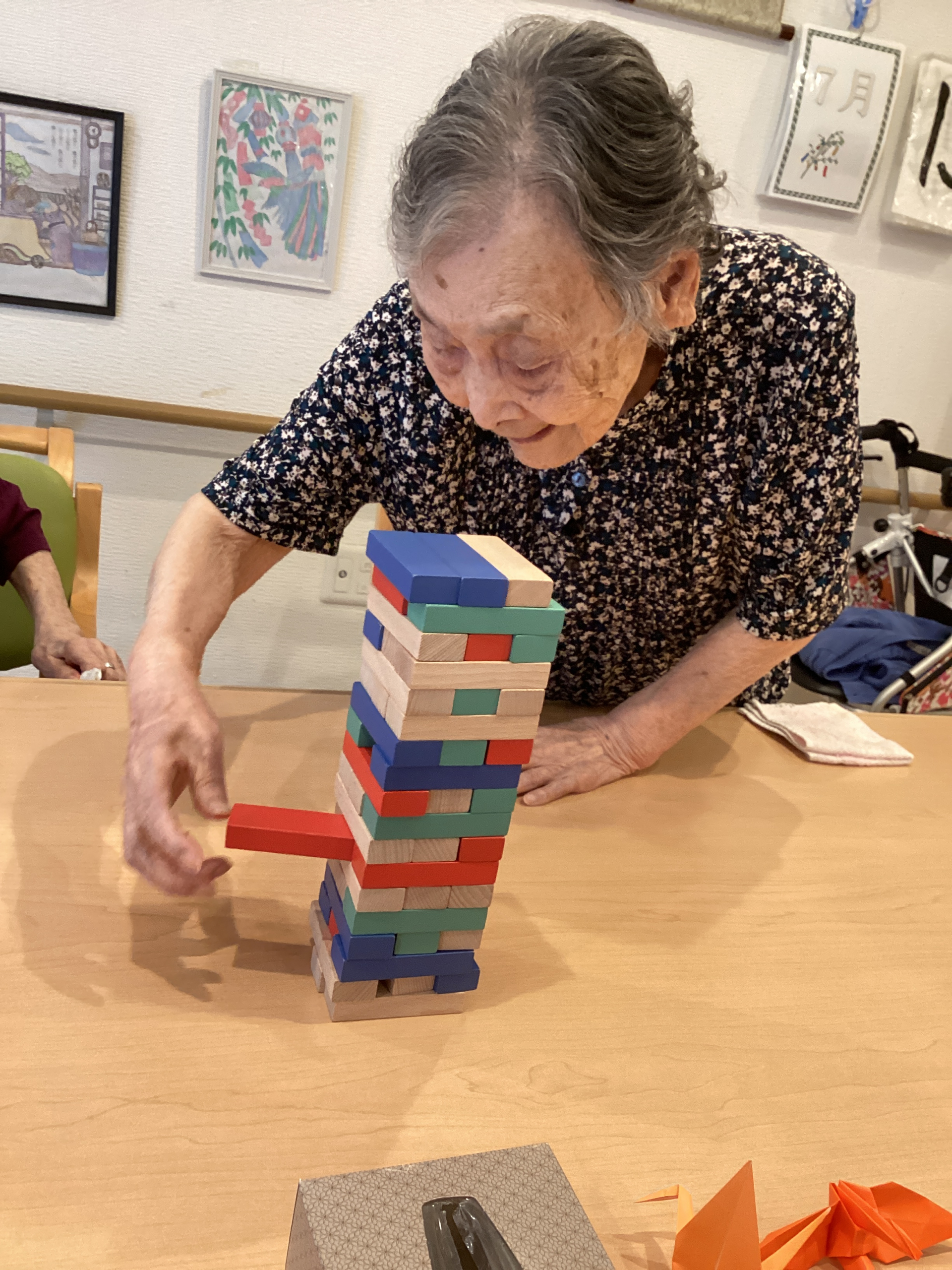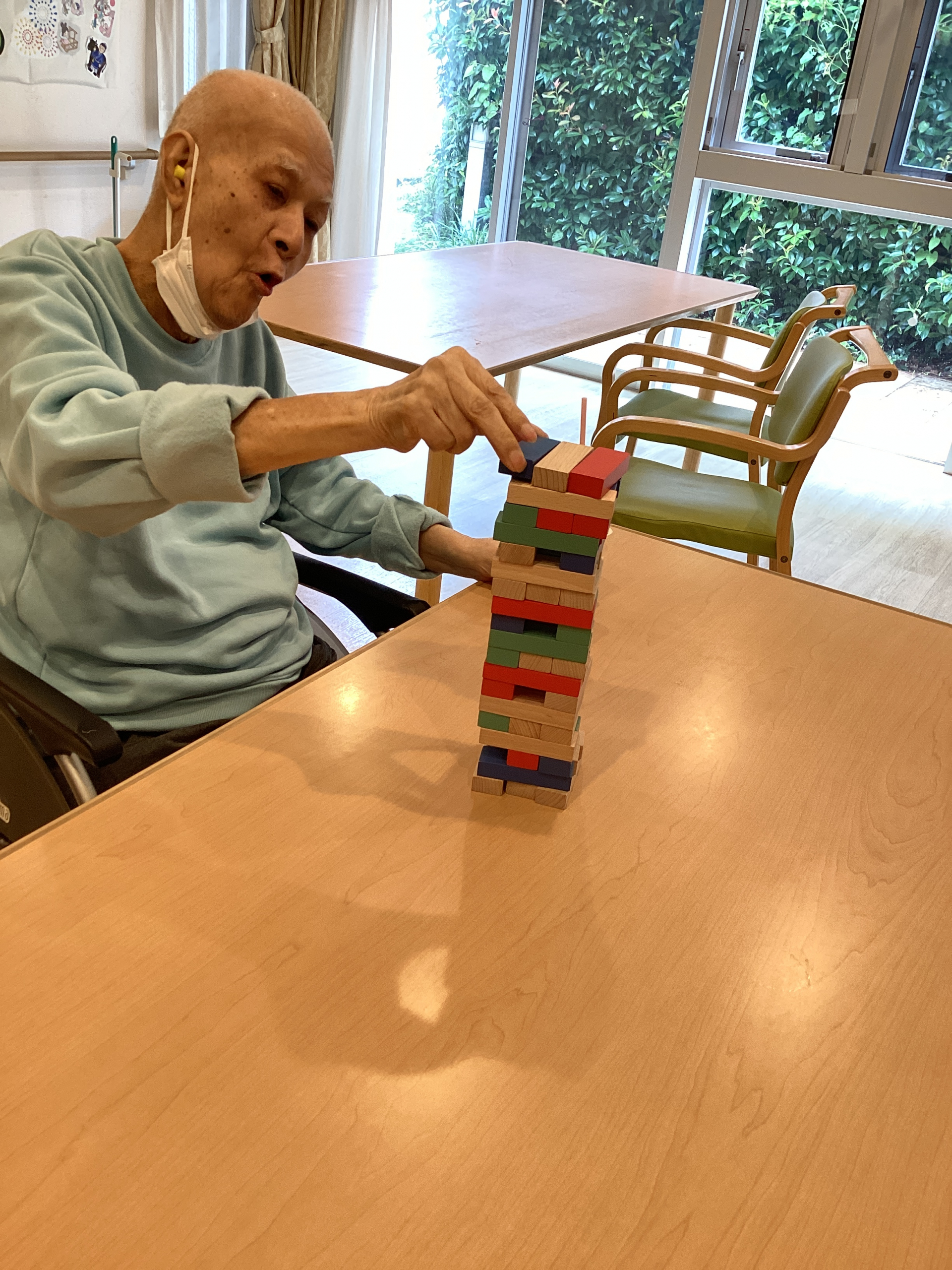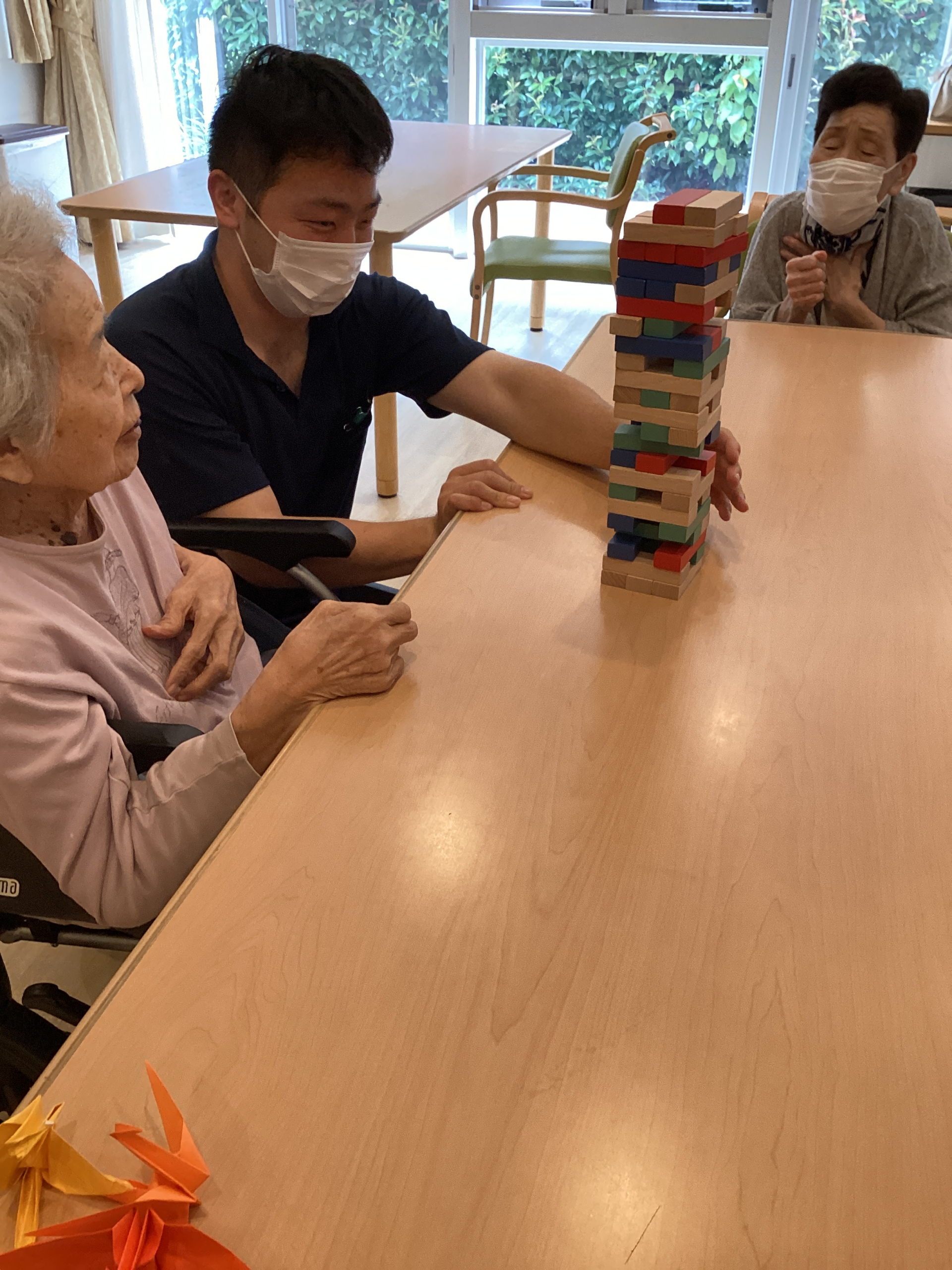 皆さん真剣な表情で積み木を抜き取り、崩れそうになるたびに「わあ!」と盛り上がって、笑いがあふれていました。