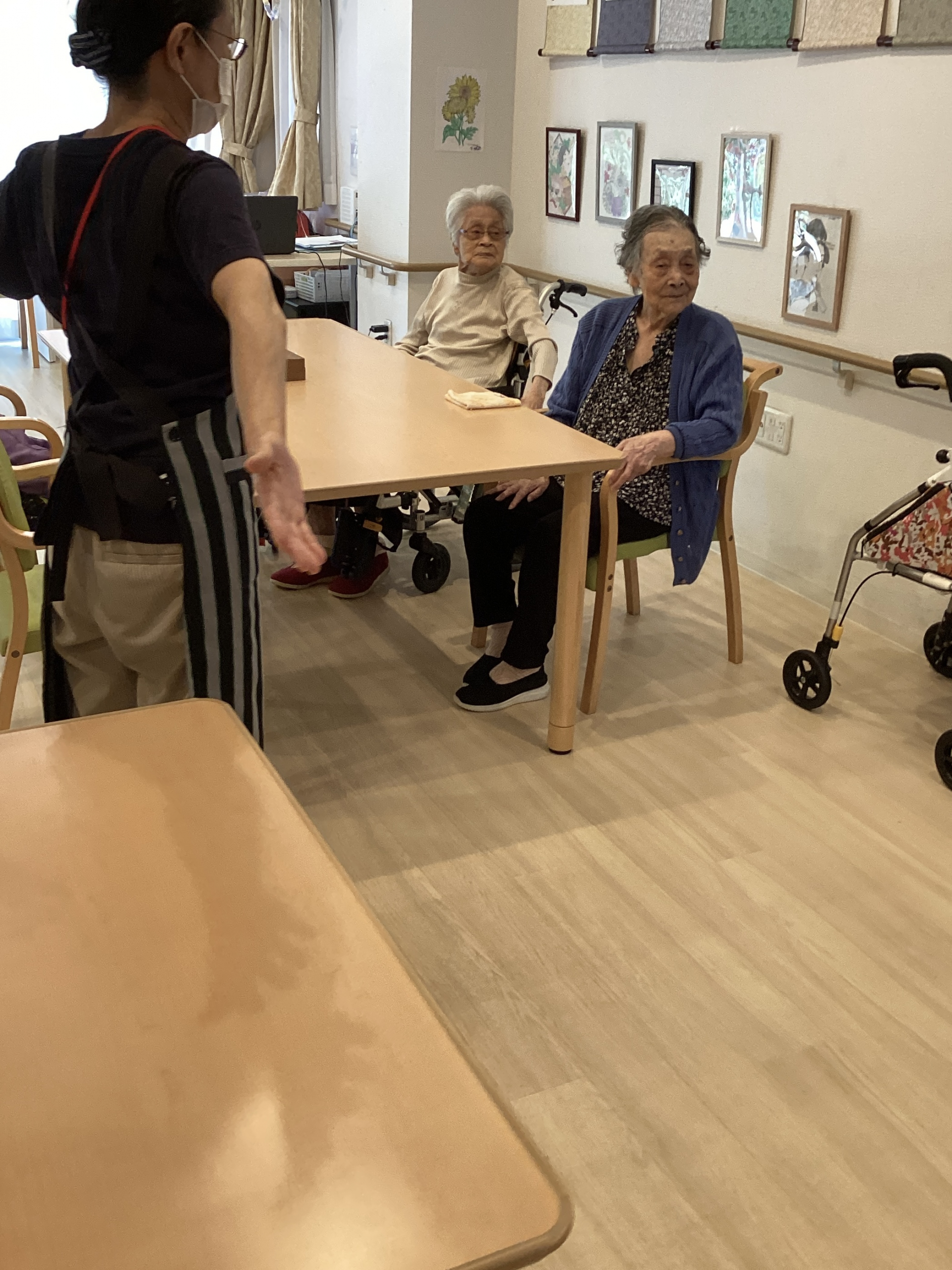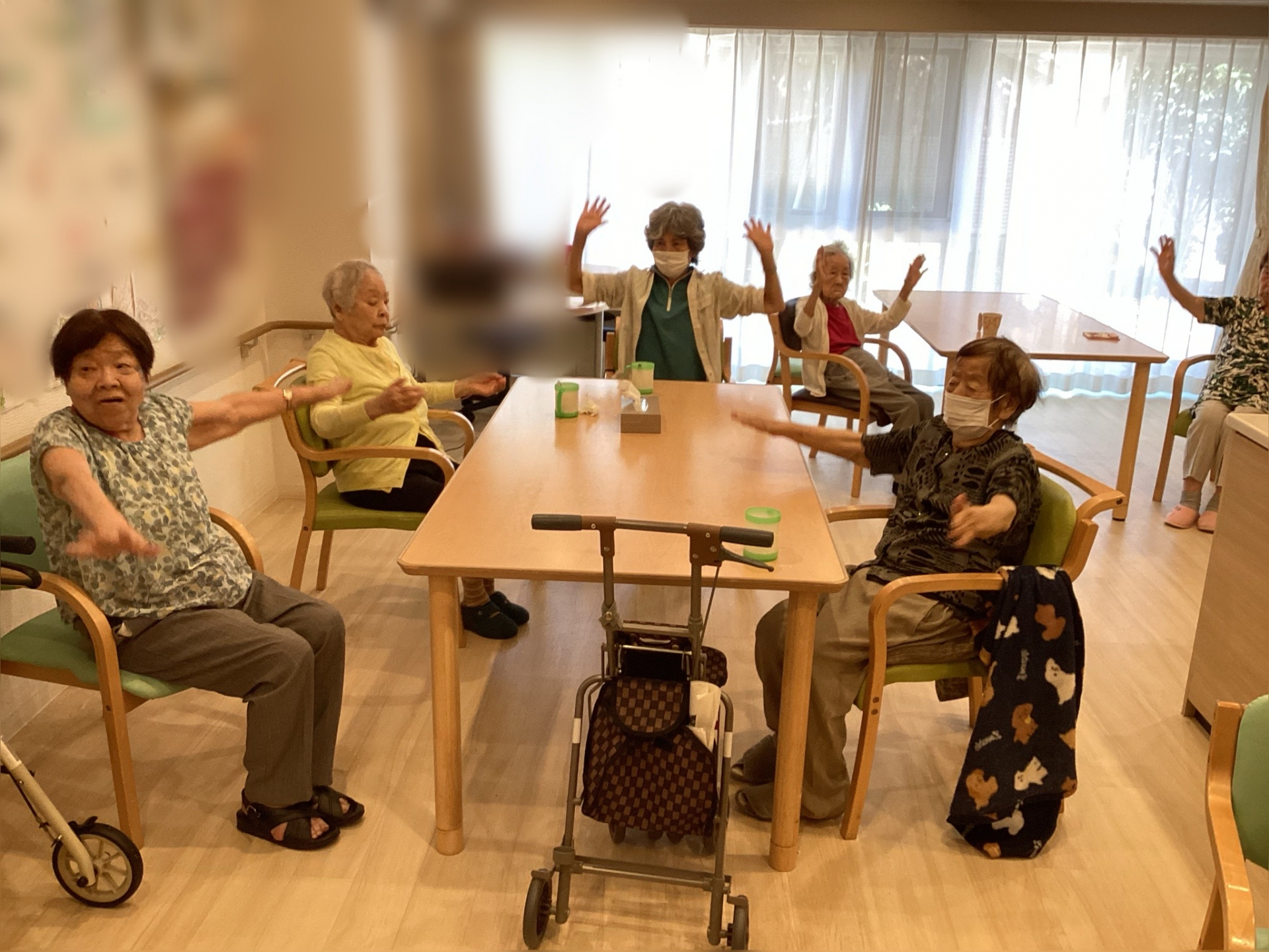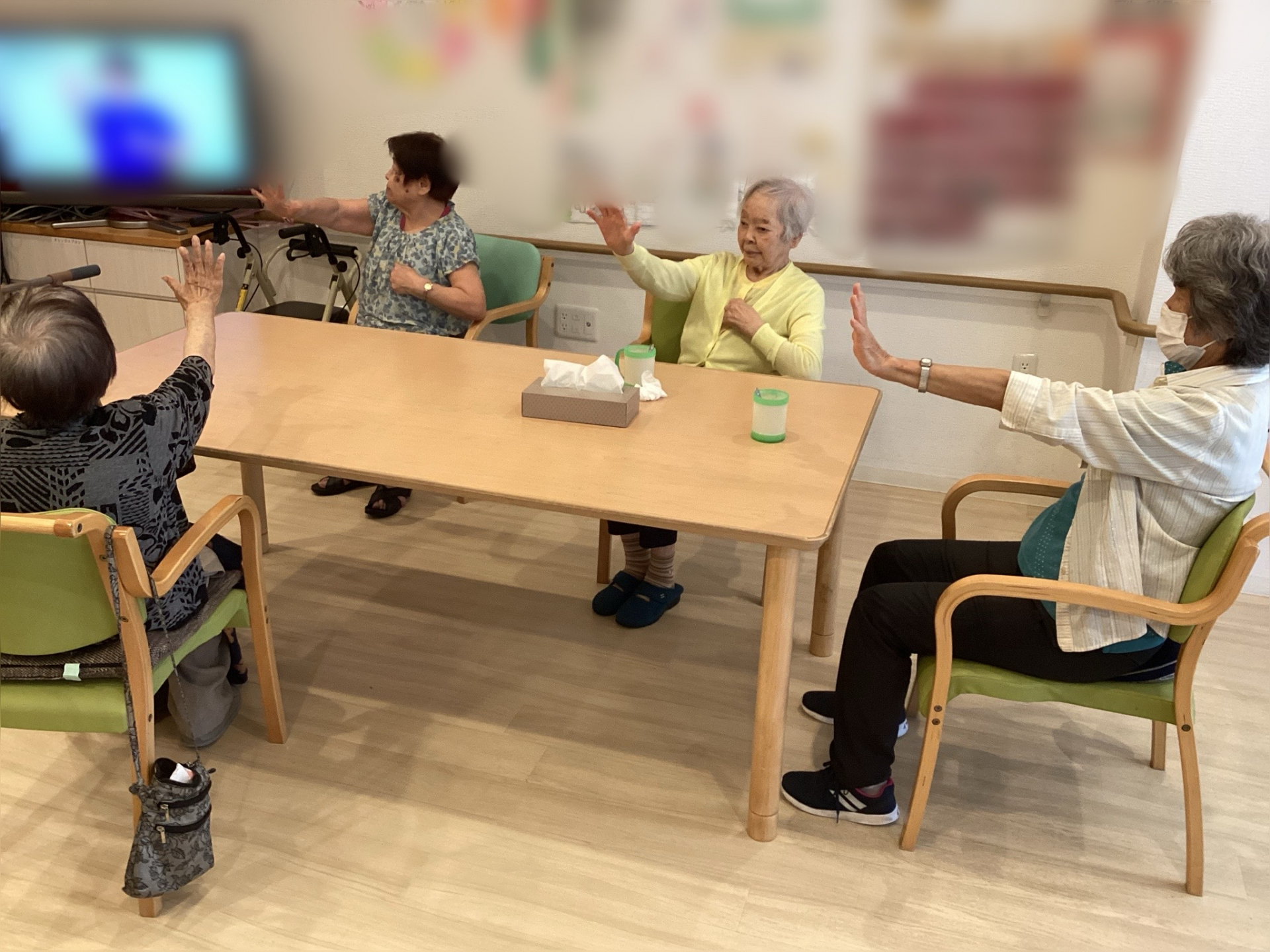 とても暑くて外に出られないので、今日は施設内でみんなと一緒に体操して、たくさん体を動かしました。