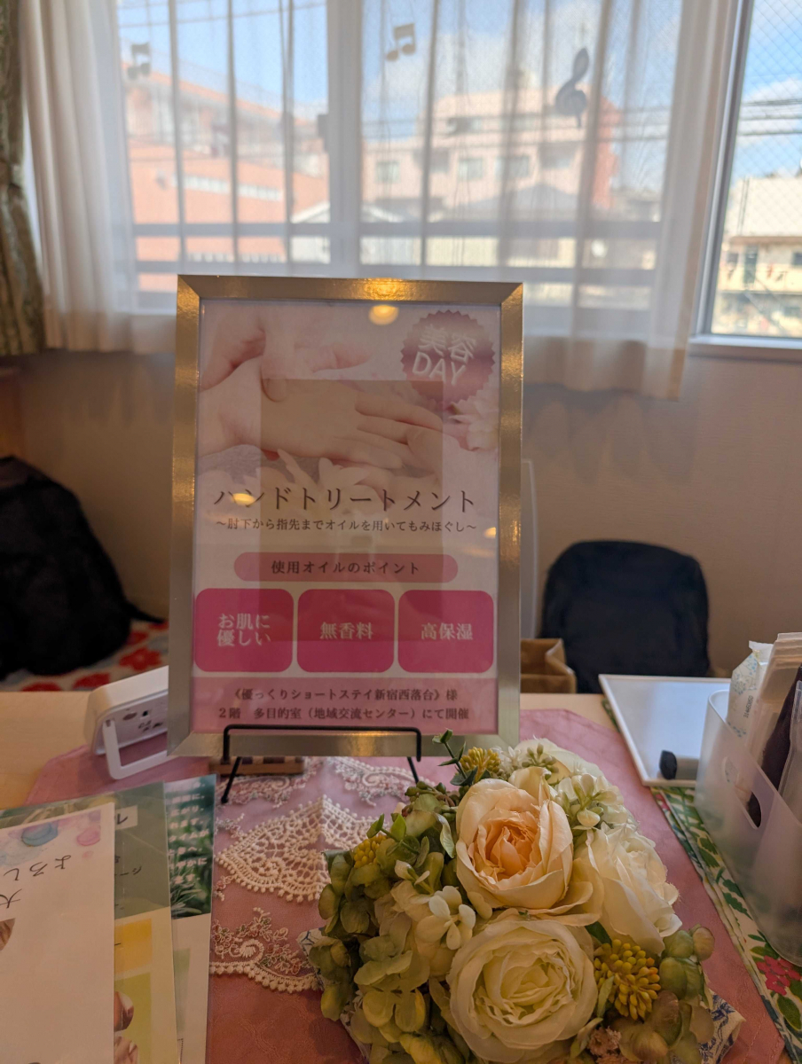 2026.03.10 お知らせ 3月から介護美容レクリエーションを開始しました! Tweet シェアする 本日3月10日より優っくりショートステイ新宿西落合では 美容レクリエーションを開始しました! 毎月2回、 個別の美容レクリエーション(ハンドマッサージ・ネイルケア・メイク&フォトなど) と グループでの季節工作レクをご提供します。 基本は毎月第1火曜日と第4火曜日の開催を予定しております。 詳しくは当施設の相談員へお問い合わせくださいませ。 皆様のご利用をお待ちしています。 事業所責任者 清水 一覧へ戻る
