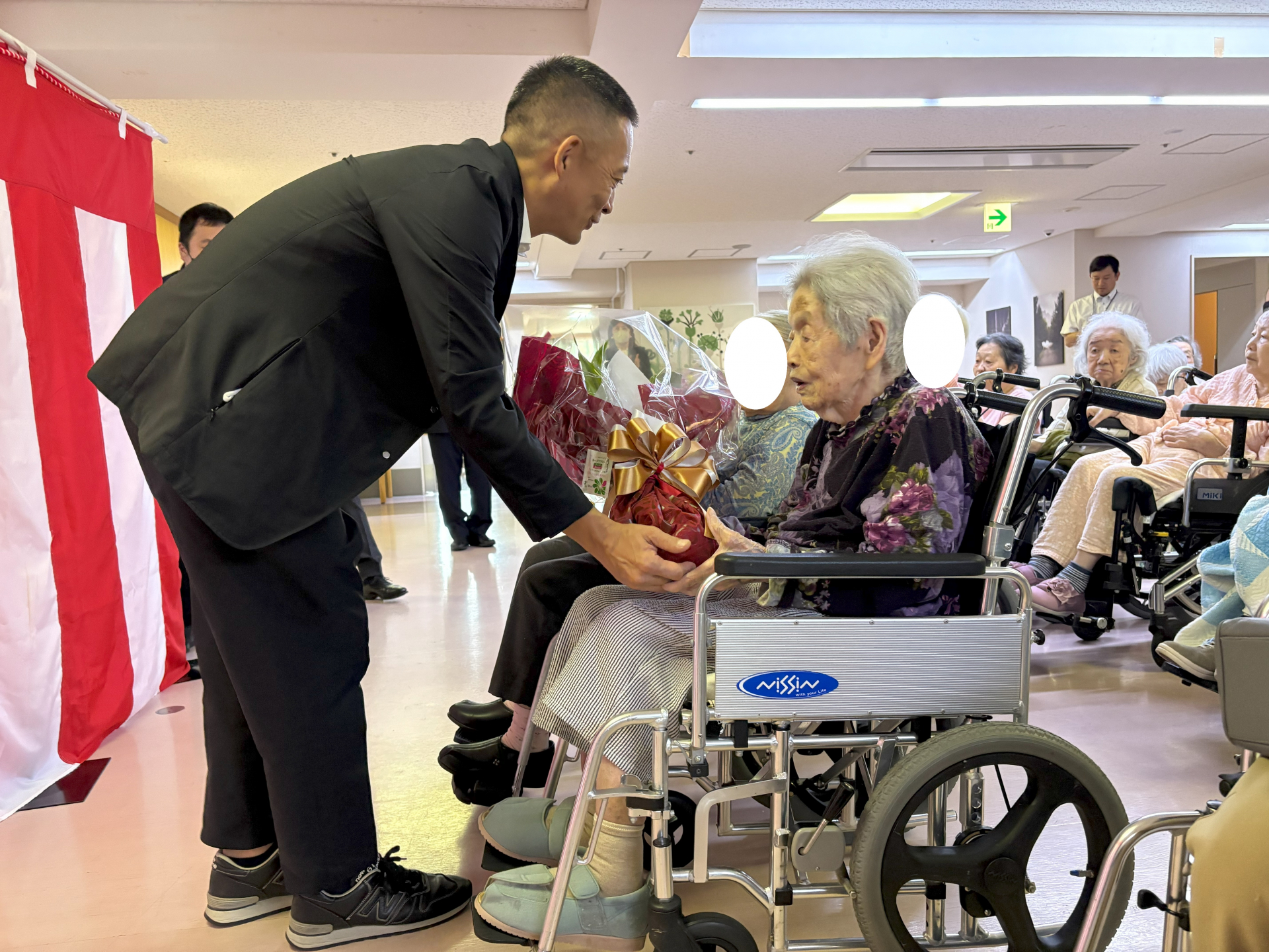 区長からお祝いのお言葉をいただき、花束も頂きました!代表して、せせらぎの最高齢(105歳)のお二人に受け取って頂きました(^^♪