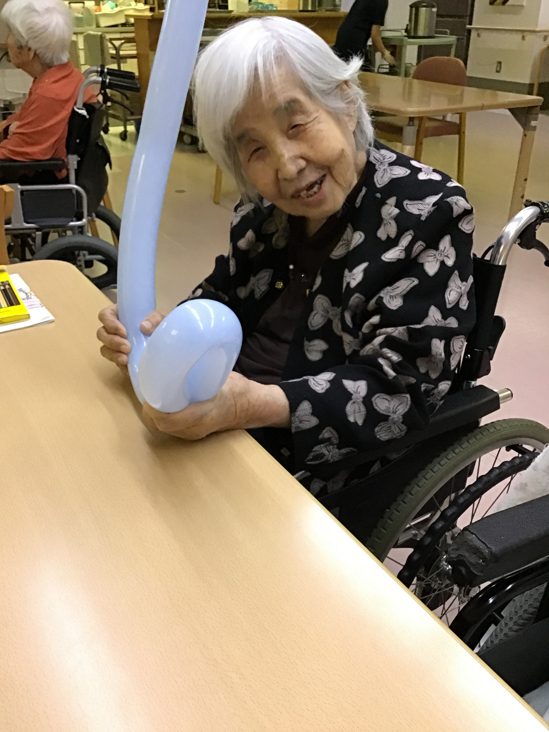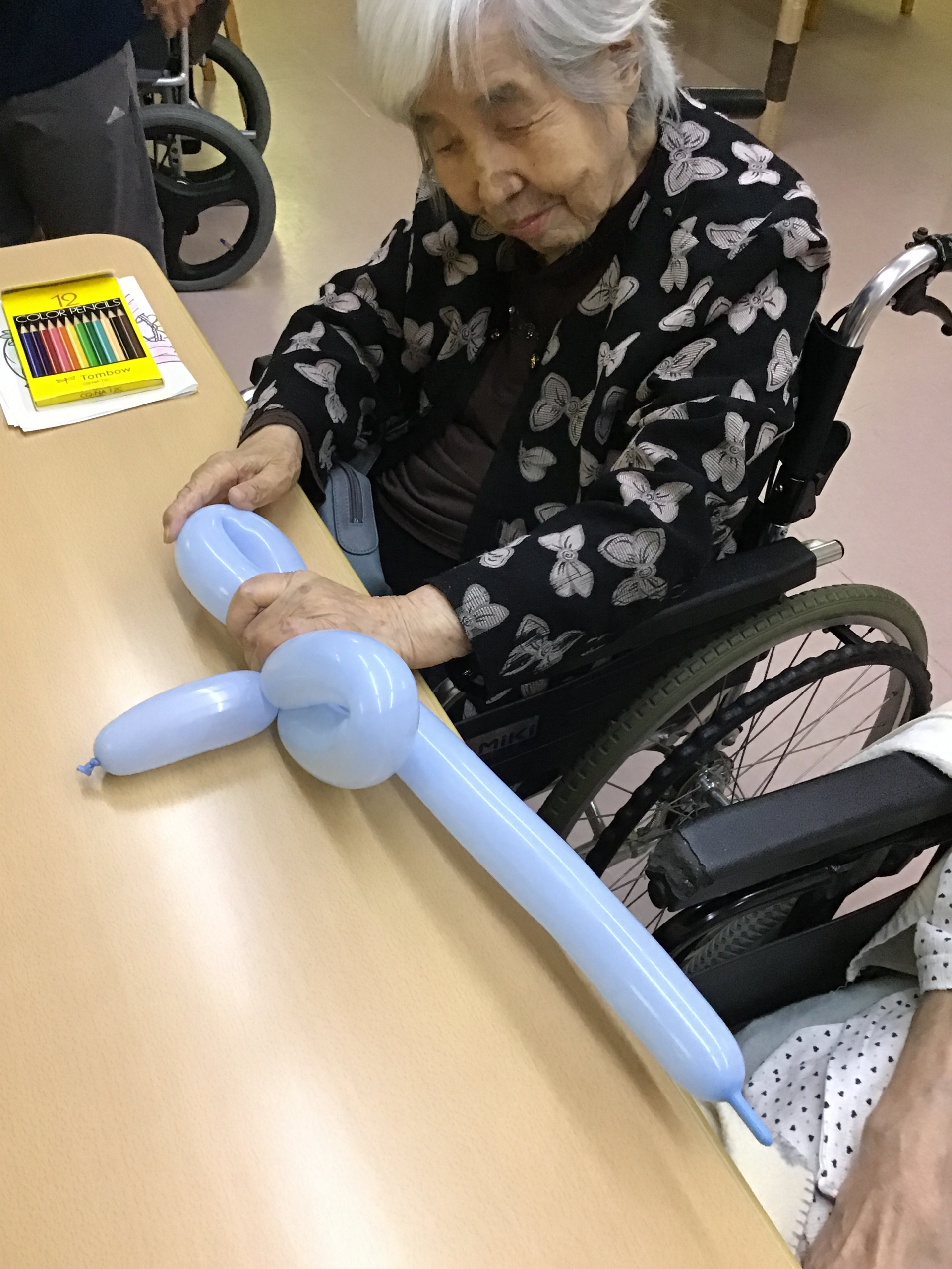 とても勇気が必要ですがH様は職員の声かけとともに風船をねじりまげております(^_^)v