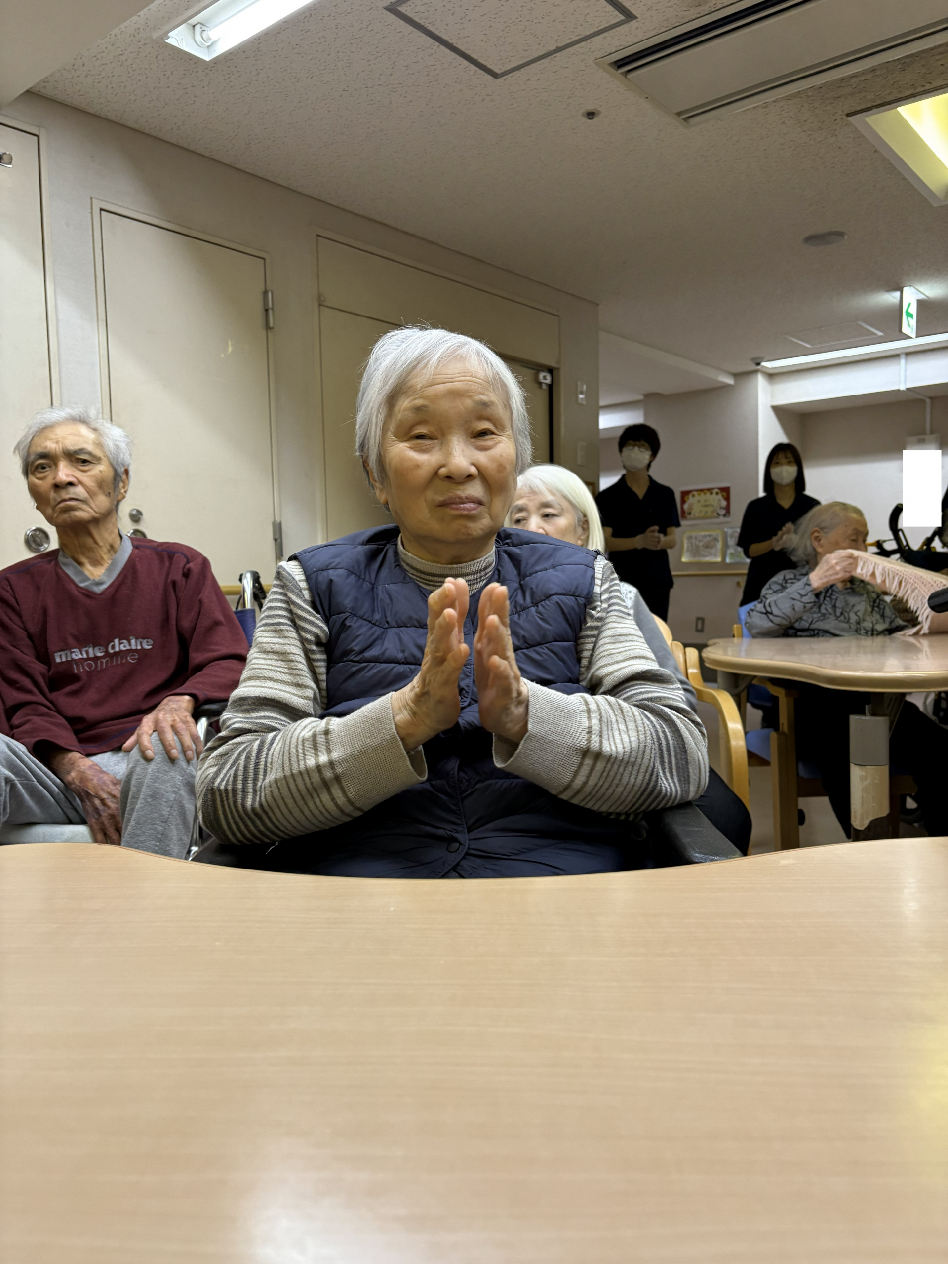 若い学生たちを見て「かわいいねえ」とお話ししながら楽しそうに手を叩いたり、一緒に歌ったりしました!