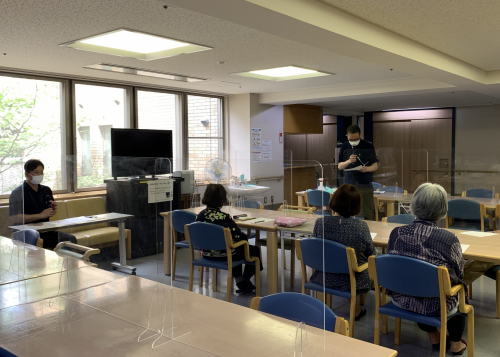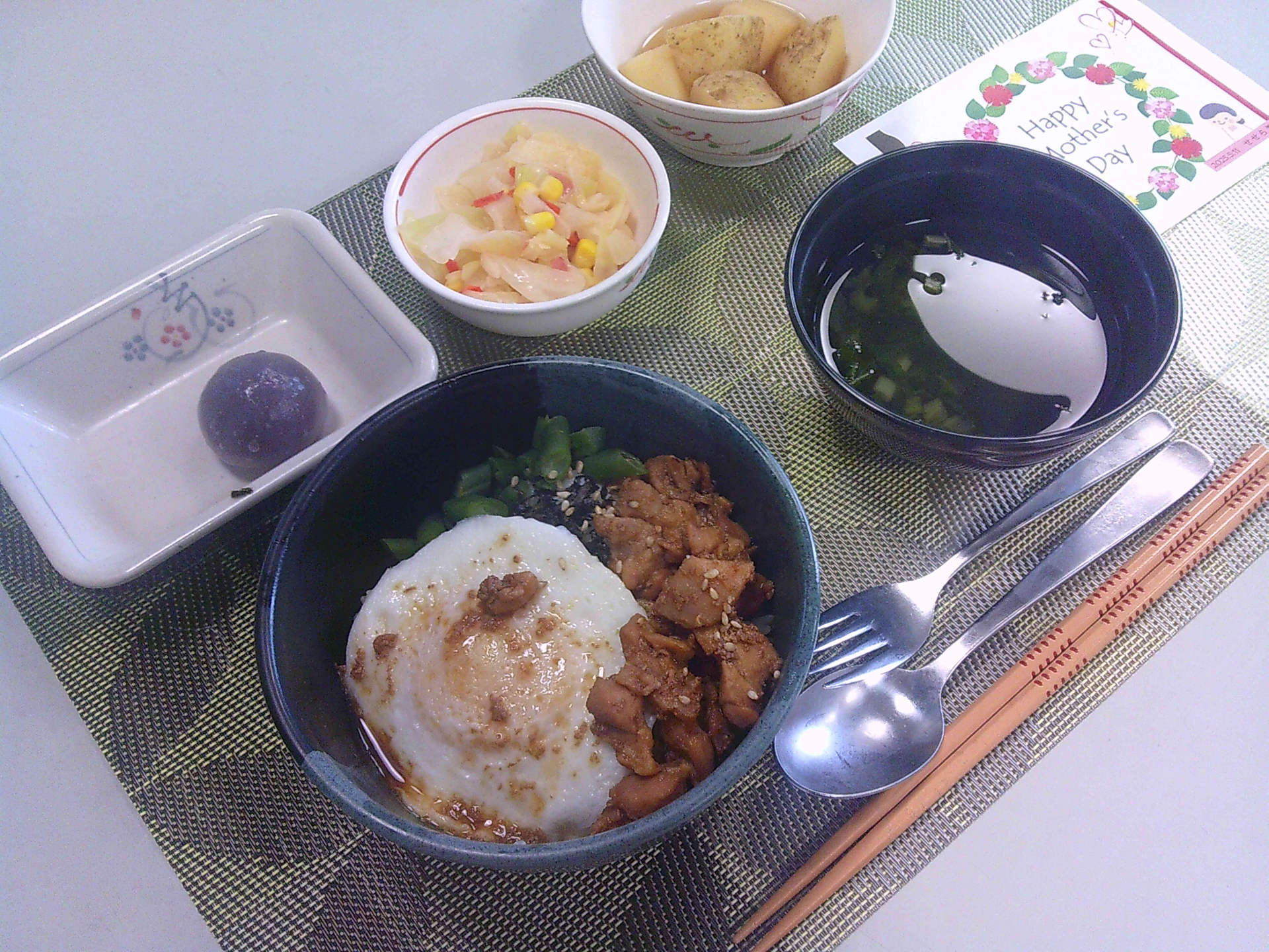 てりたま丼、清汁、新じゃがの煮物、キャベツとコーンのサラダ、水まんじゅう