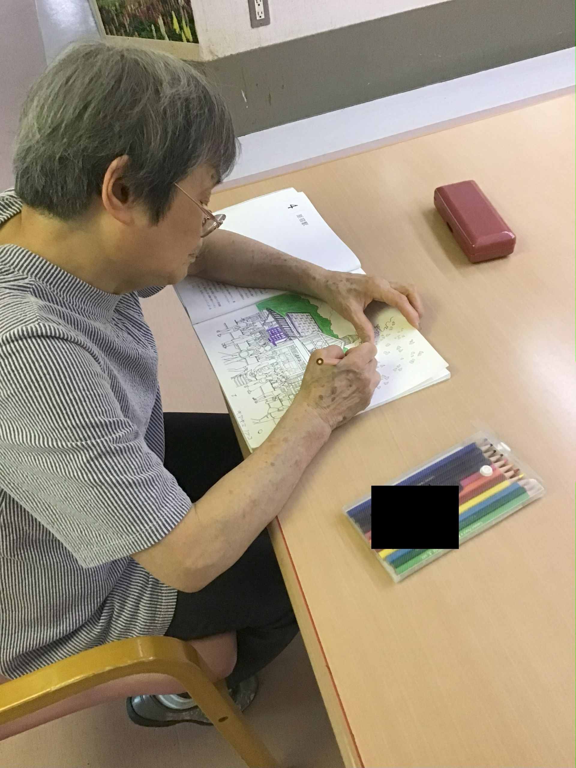 フロアで少しのお時間を見つけると持参された塗り絵をされます