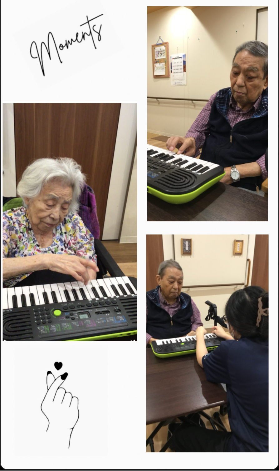 職員と一緒に鍵盤を押しながら音を出すことで、音楽を楽しむだけではなく、指先の運動にもつながります。