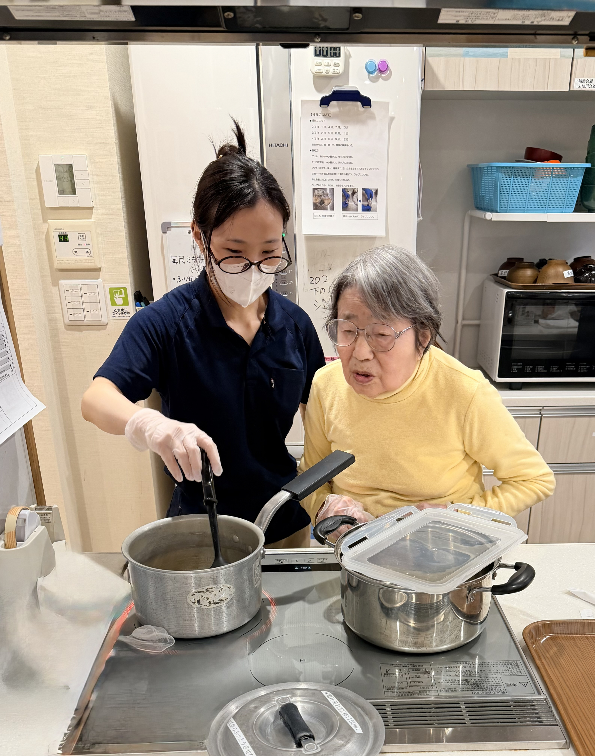 入居者にも参加して頂き、鍋で寒天液をゆっくり混ぜながら