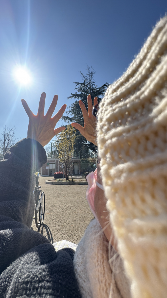 日光浴をしている時、Sさんが手を上げるのが見えました。理由を尋ねると、手のひらも日光浴する必要があるから』と答えられました。その答えを聞いた後、なるほどと思い、Sさんの真似をして同じようにしました。