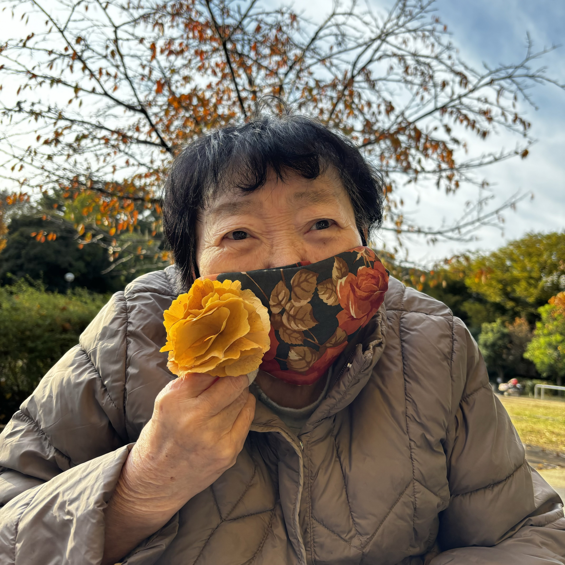 イチョウを目の前にすると「うわぁ!きれいだ!」と笑顔で仰られ、職員がイチョウの葉を渡すと笑顔で写真に写って下さりました!