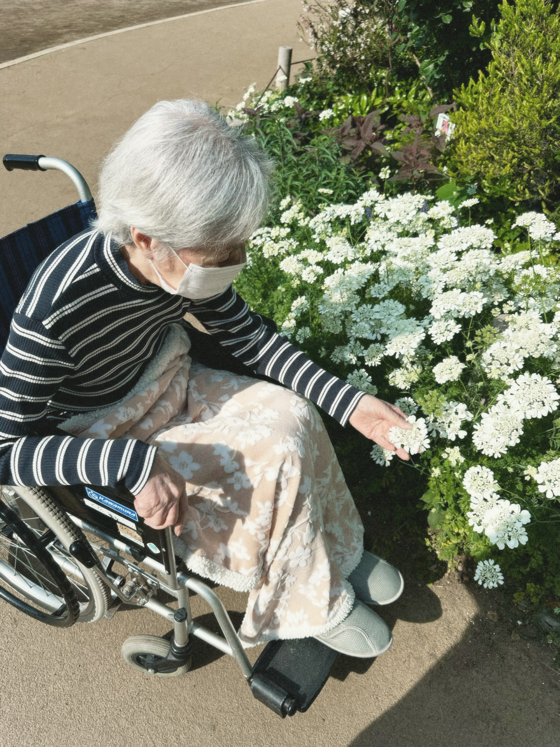 公園に近づいていると「わぁ~本当にいい天気!ありがとうね本当。」と笑顔で仰っていました。花や木に近づいていくと「素敵な花ね~」と葉っぱを触りながら楽しそうにお話をしてくださりました。
