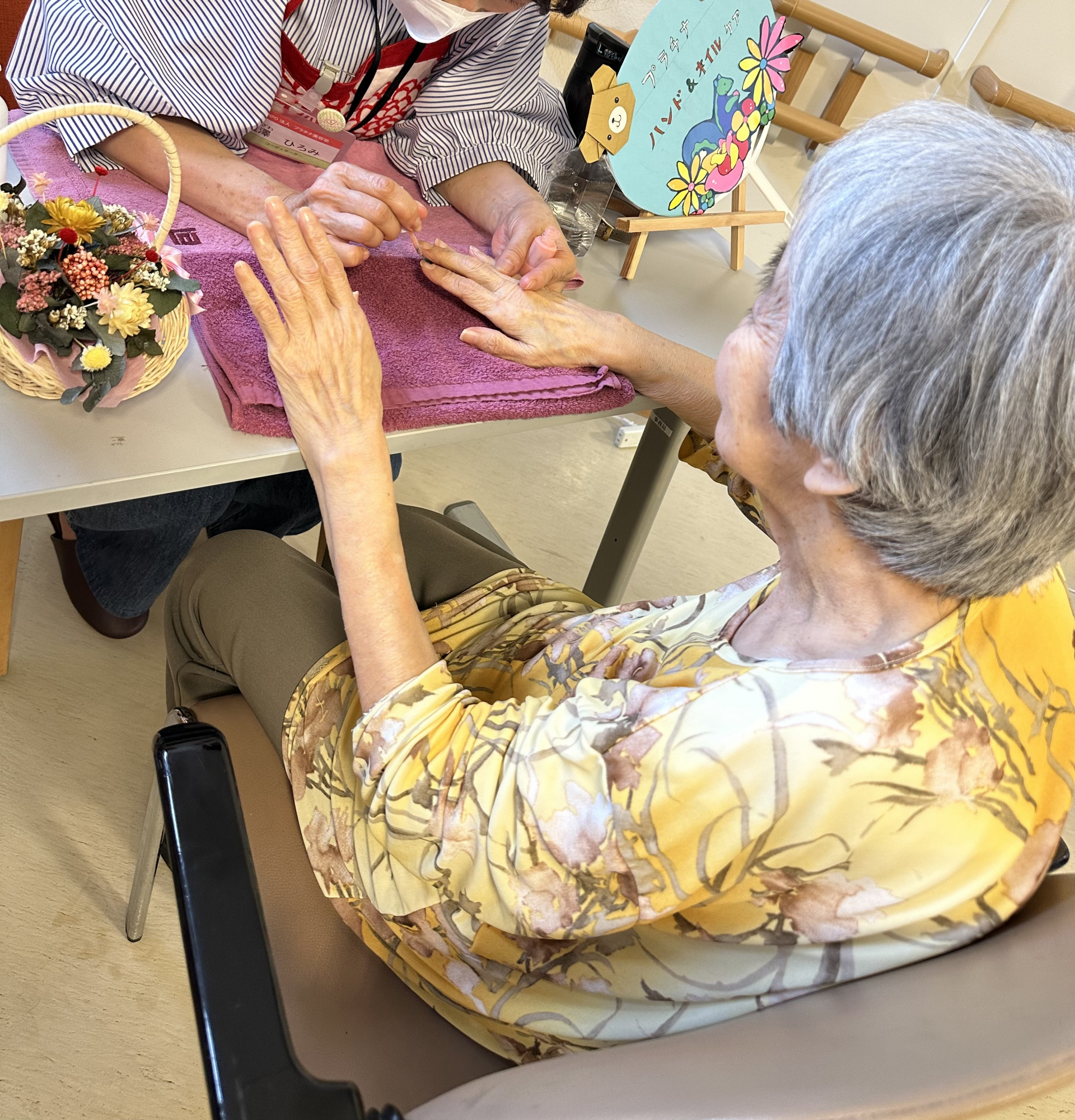 ハンドケアを受けて、皆様とても楽しんでいるご様子が見られました。最初にハンドマッサージをすると「いい気持ち」とおっしゃっていました。