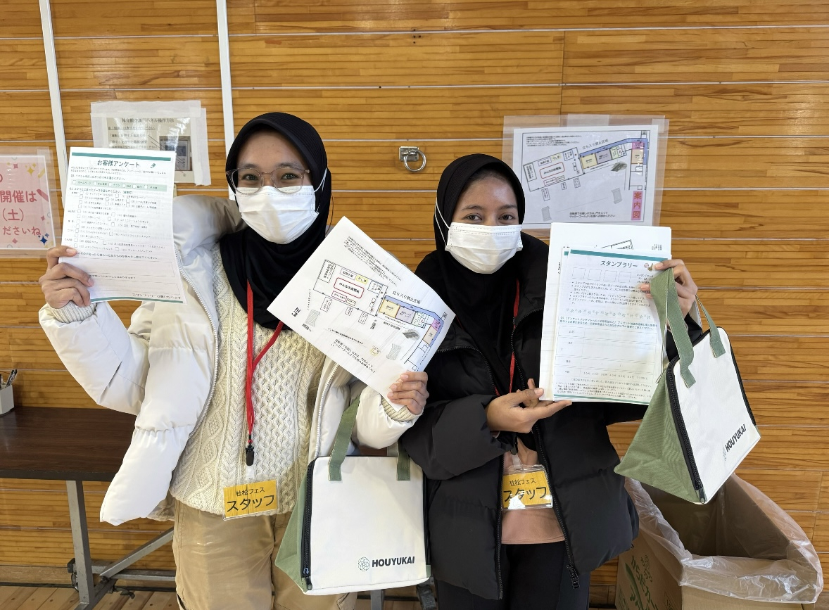 当日は、来場された方々がスムーズに会場内を回れるよう、内容図の配布やアンケート用紙の配布を担当しました。